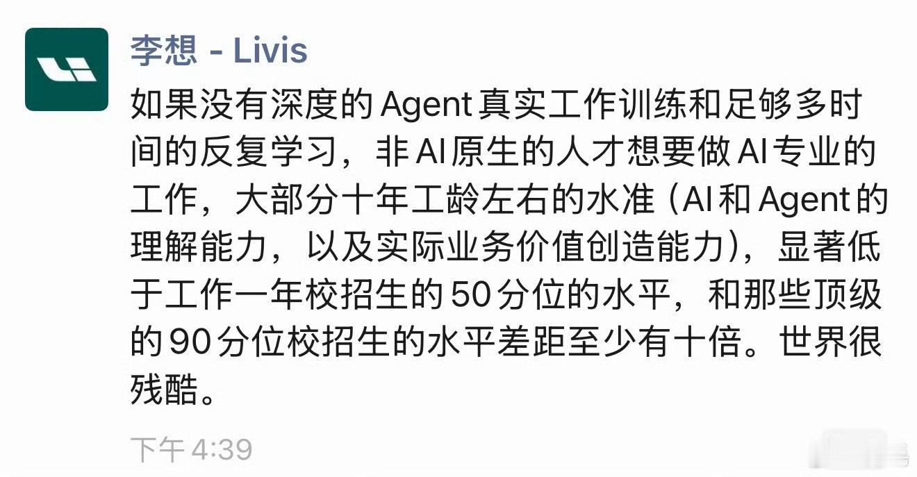 不说制造焦虑吧,但想子的观点真的很扎心。在企业里混了十几年的老员工,AI能力可能