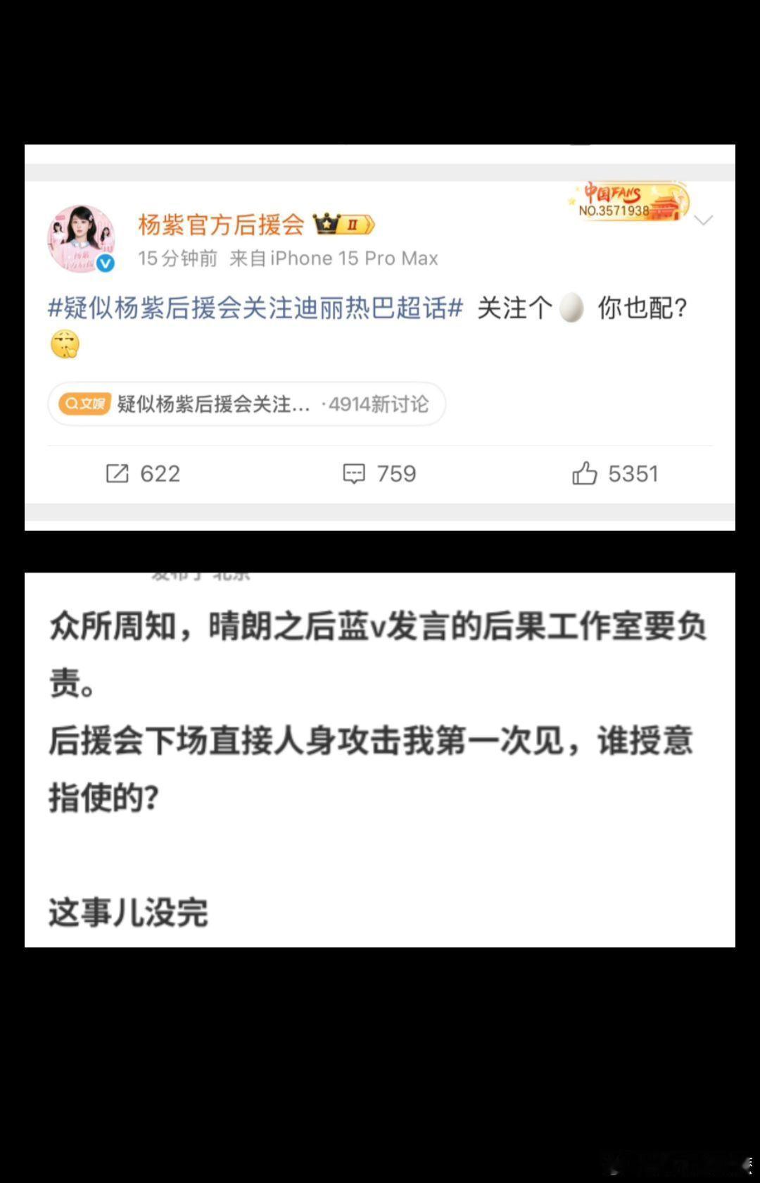 疑似杨紫后援会关注迪丽热巴超话 后援会蓝V官号敢无视清朗,下场网暴无辜女明星,史无前例!!!谁授意的?😓😓迪丽热巴 杨紫官方后援会停止转移视线