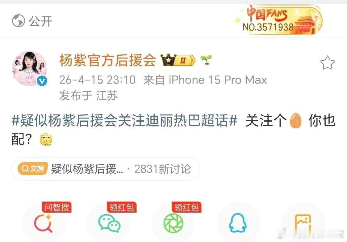 疑似杨紫后援会关注迪丽热巴超话 后援会蓝V官号敢无视清朗,下场网暴无辜女明星,史