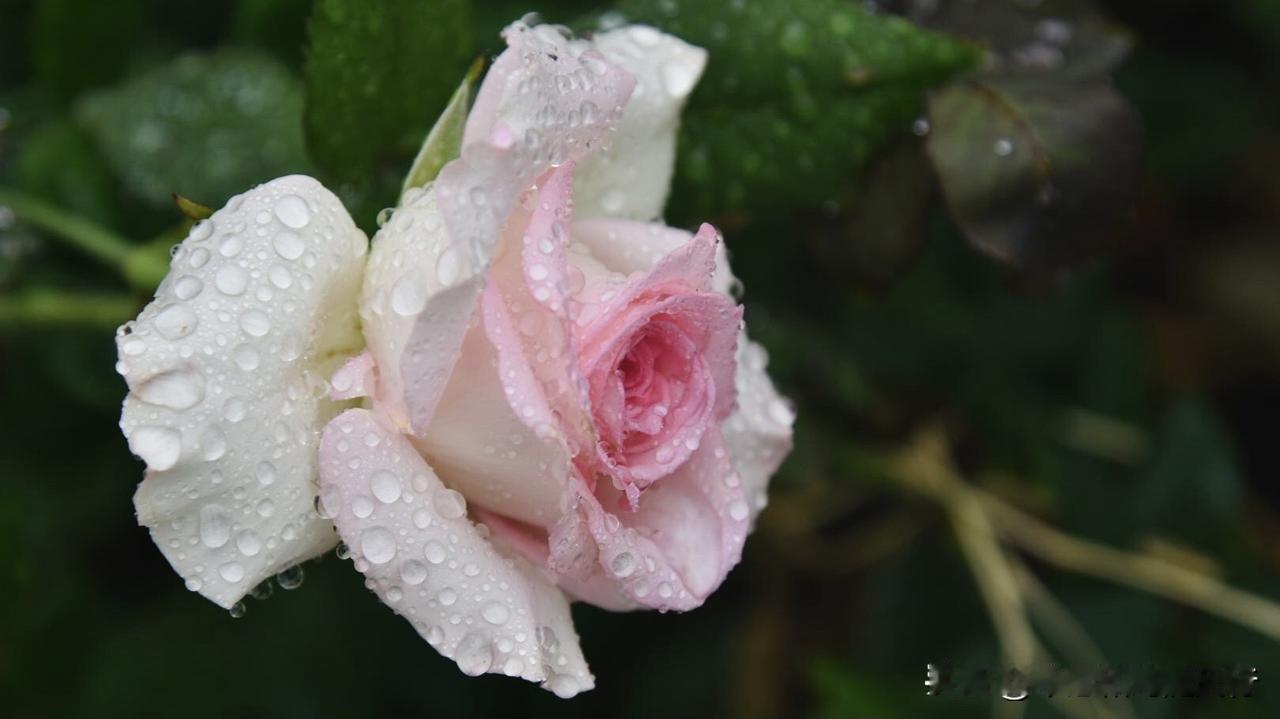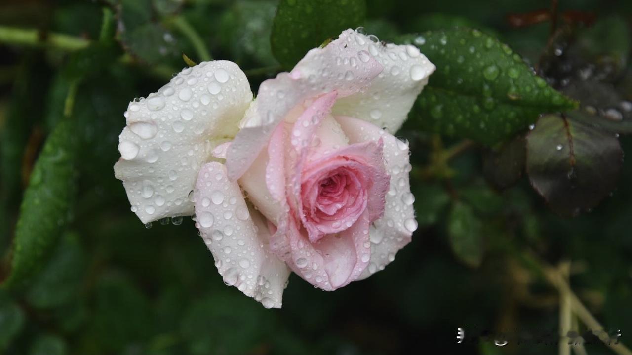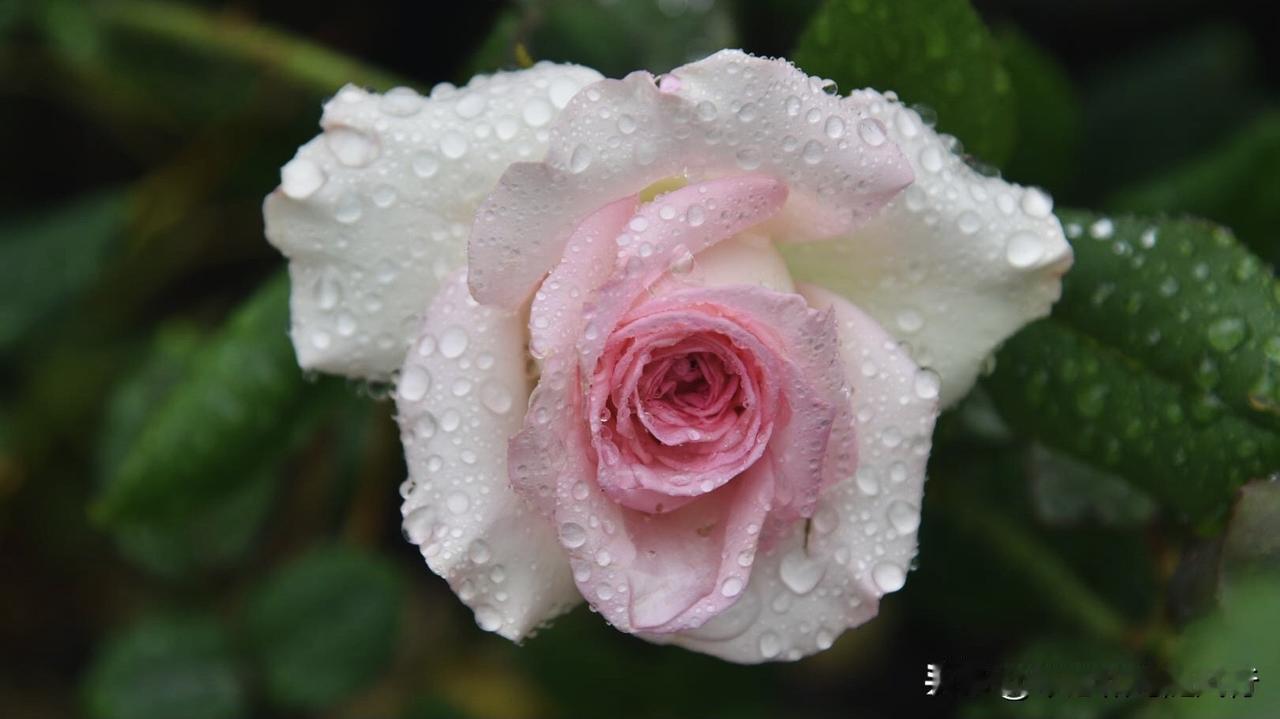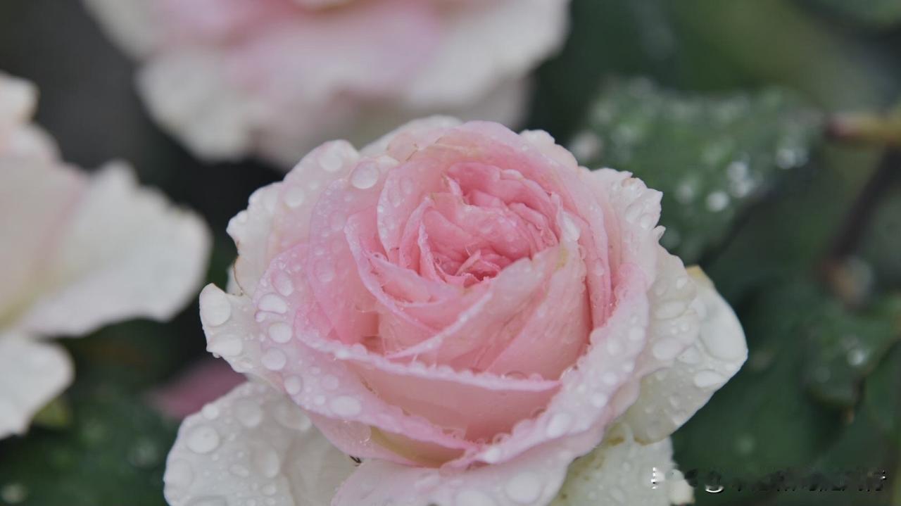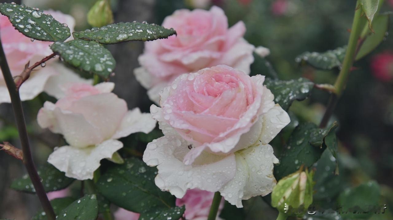春雨洗礼后的洛神月季,将春色揉进了花瓣,外层奶白、内芯深粉的渐变花色,被雨水浸润