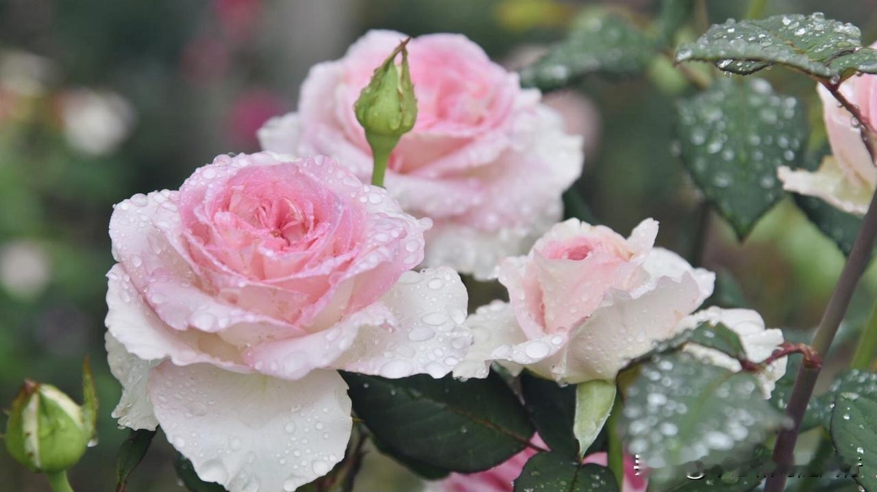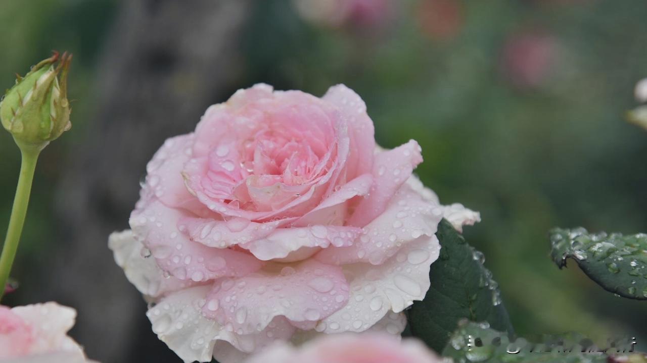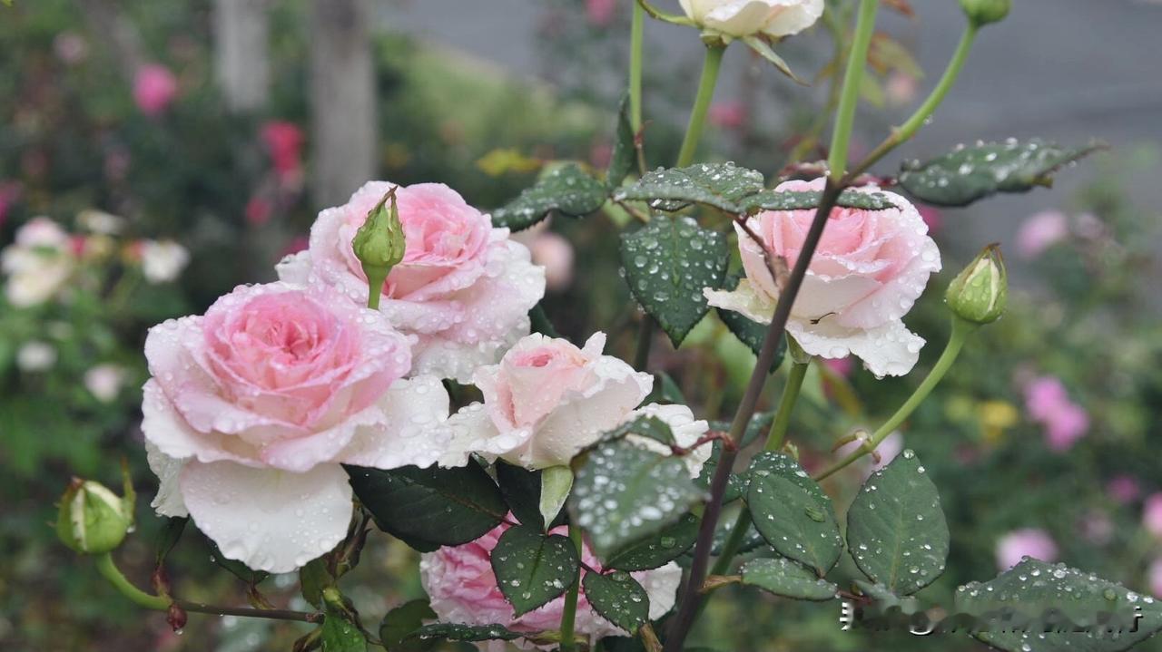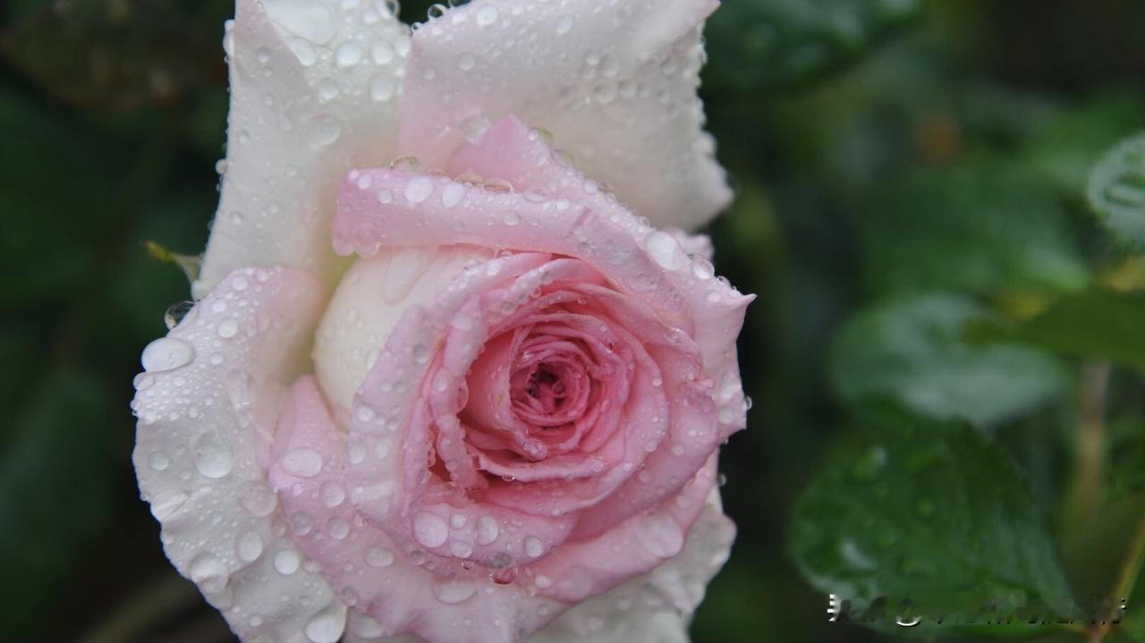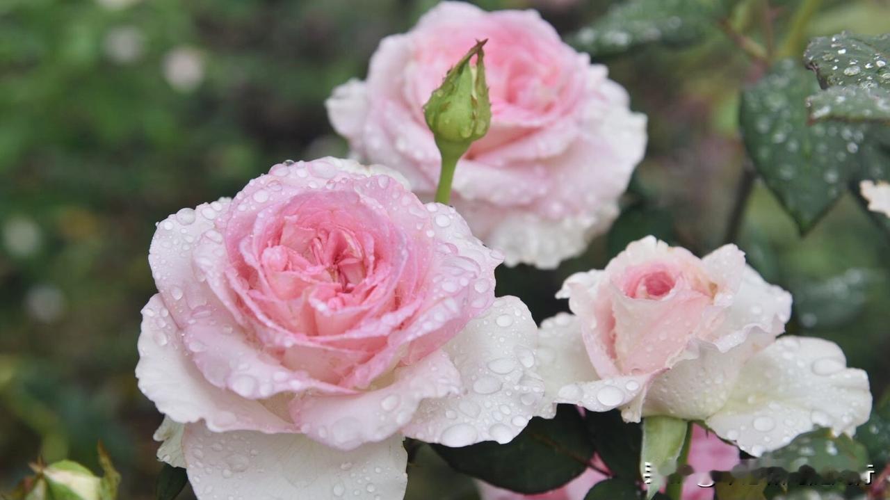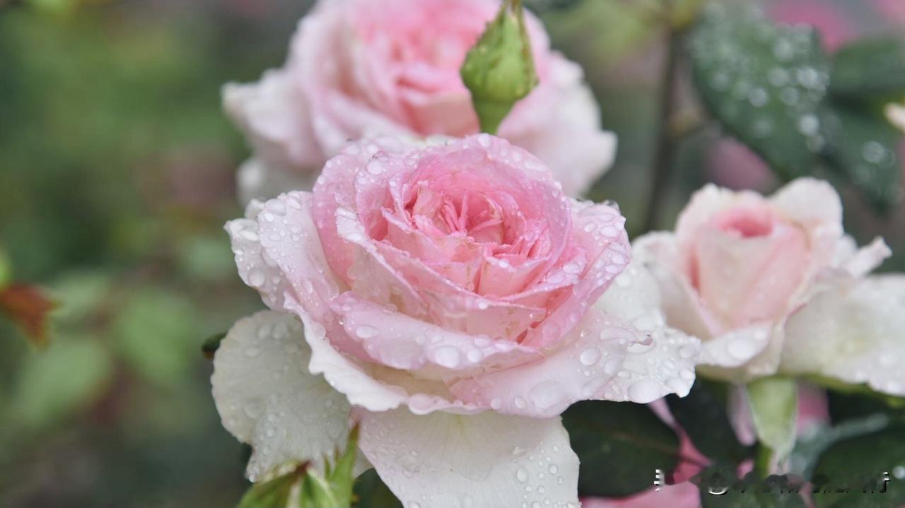 春雨洗礼后的洛神月季,将春色揉进了花瓣,外层奶白、内芯深粉的渐变花色,被雨水浸润