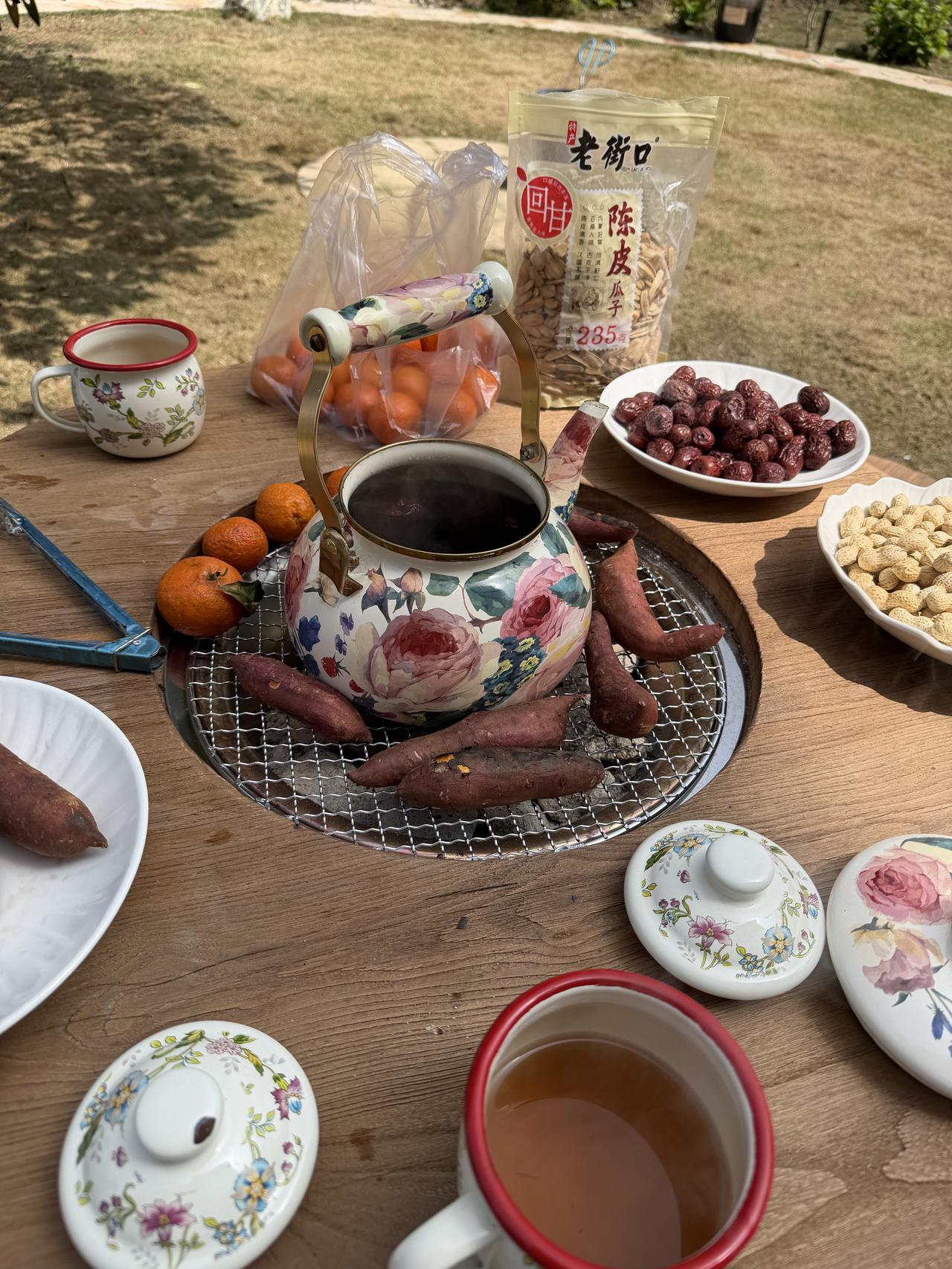 风一阵一阵地吹过来。烤红薯的甜,煮白茶的香,混在一起,绕着花园转。