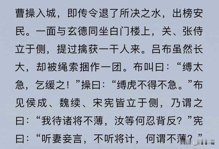 白门楼吕布被俘,因为绳子捆得紧,和曹操有段对话,原著里很简单,可电视剧里加了一句