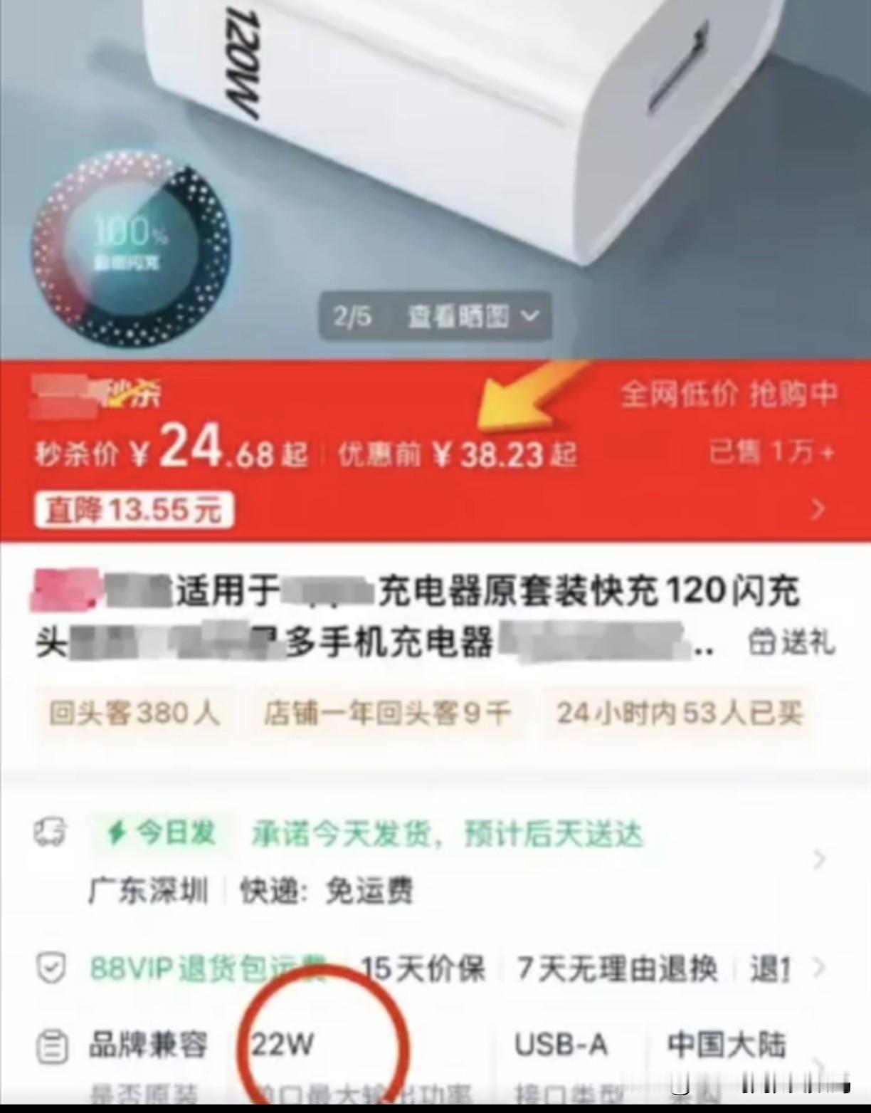 电商上很多低价“120W超级闪充”充电器,实际功率只有约22.5W,商家却辩称120W是商标或型号而非功率,甚至同款内部硬件只换贴纸就标不同功率卖不同价格。