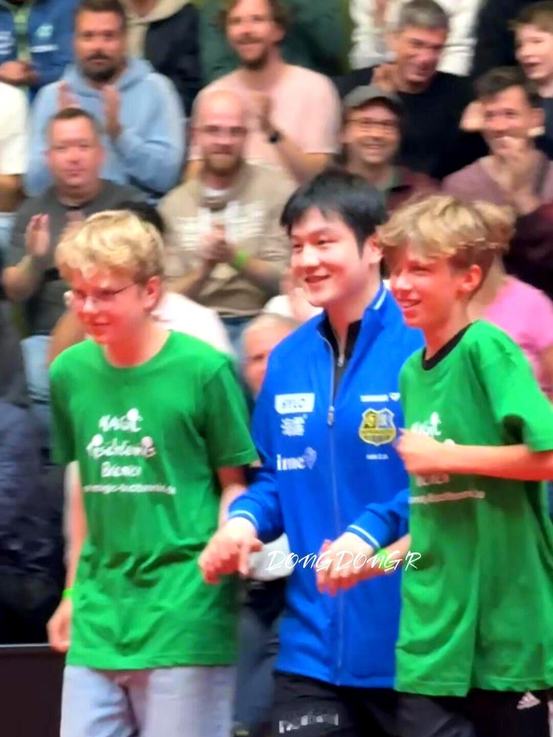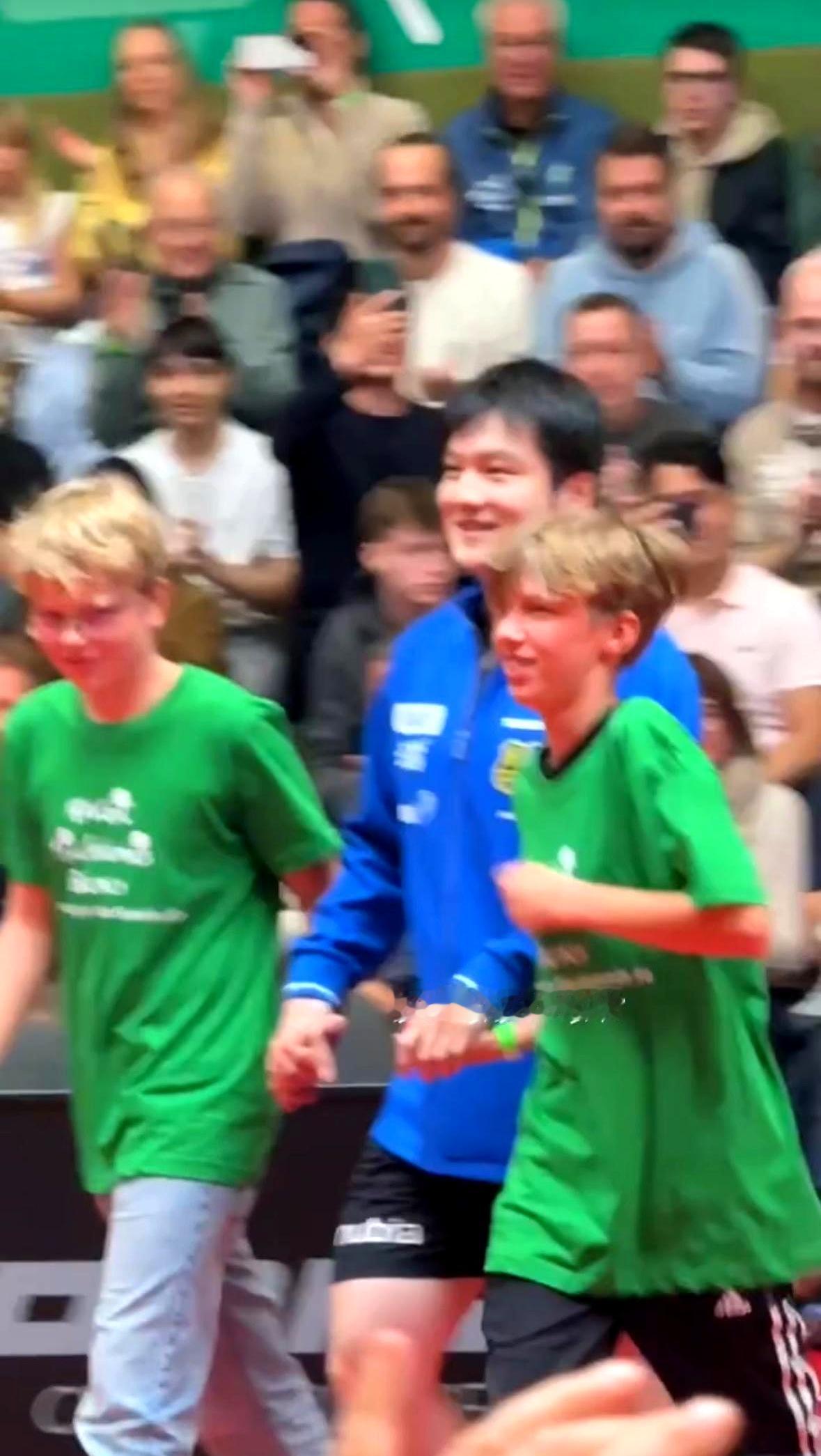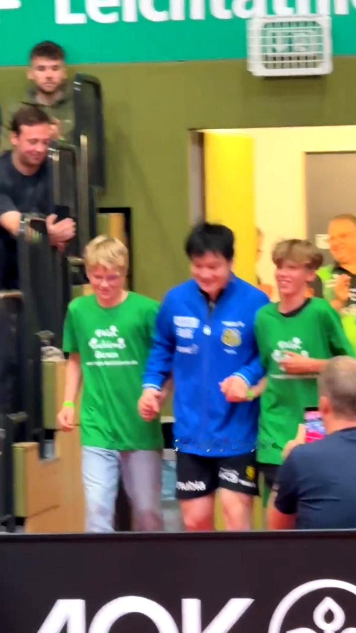 樊振东萨尔布吕肯谢幕战完美收官! 入场时他牵着小球童跑步进场,脸上挂着笑。