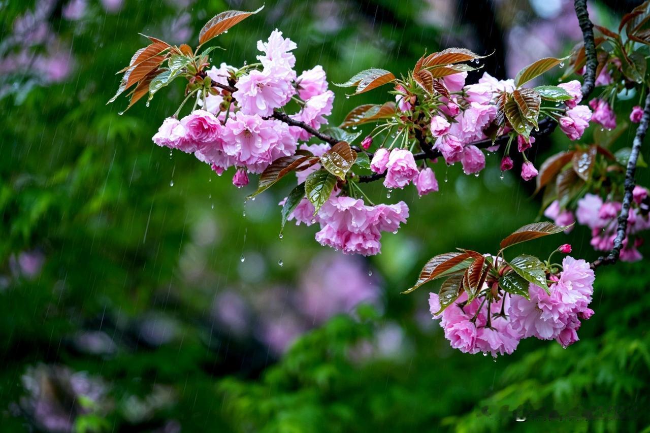 沙光明的《雨中晚樱》,晚樱在雨中绽放,透着春日的温柔与美丽。