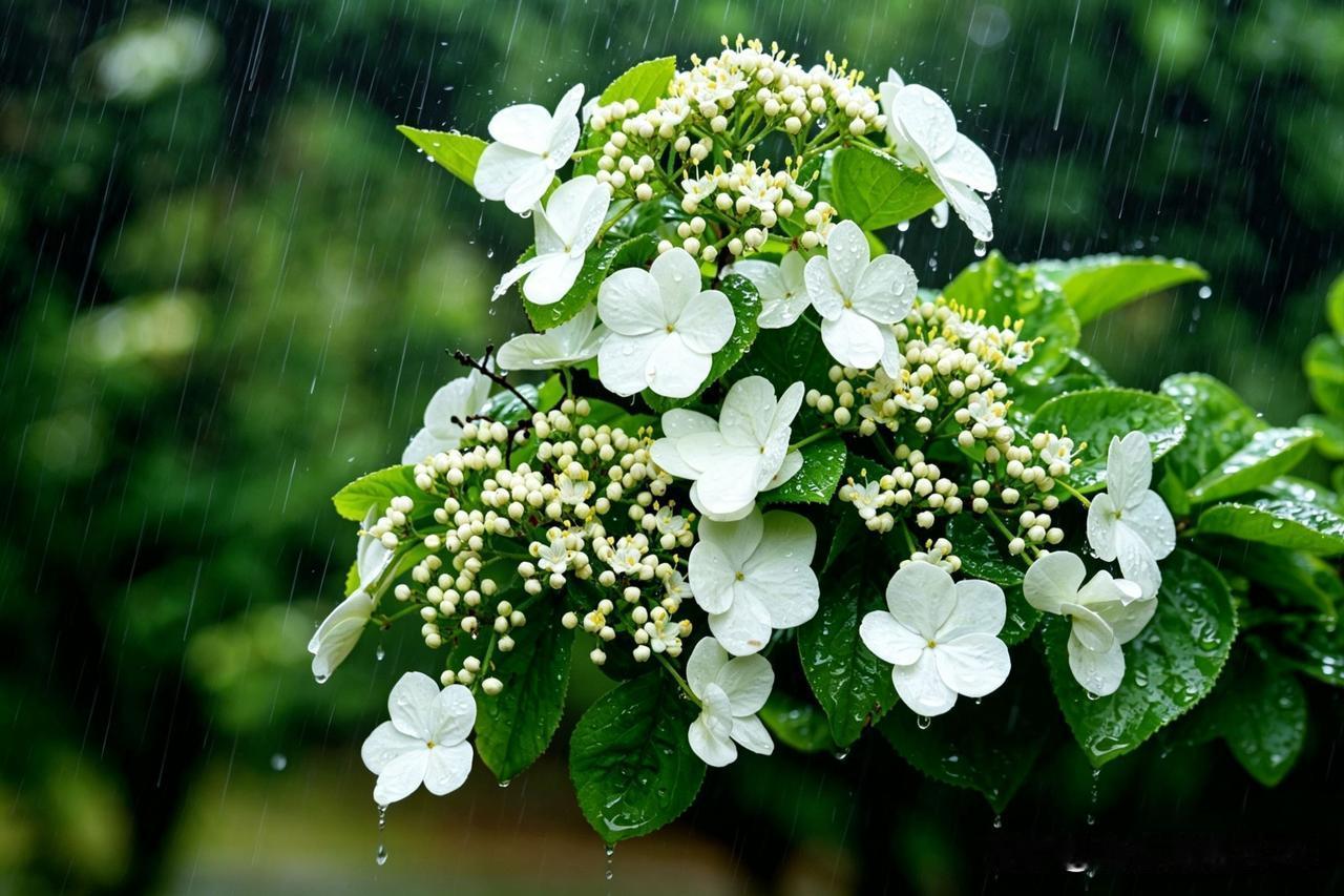 沙光明的《雨中琼花》,琼花在雨中绽放,透着春日的清新与纯洁。