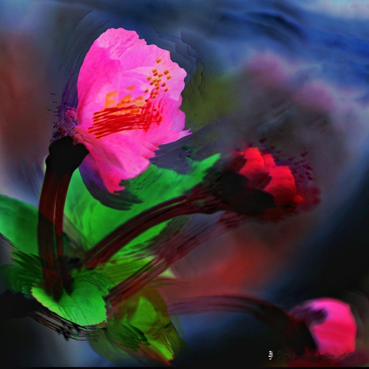 虞惠英的《花影流彩》,花影在雨中流动,透着春日的浪漫与诗意。