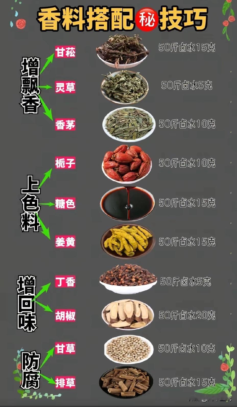 - 麻辣卤水配方:5 升水,八角 10 克、桂皮 8 克、香叶 6 片、草果 4 个、丁香 3 克、小茴香 5 克、花椒 20 克、干辣椒 30 克、白芷 5 克、白蔻 5 克、红曲米 50 克、糖色 100 克、盐 50 克、生抽 100 毫升、老抽 50 毫升。同样将香料包好,放入水中煮 1 小时。这锅麻辣卤水适合喜欢吃辣的朋友,卤出的食材麻辣鲜香,让人欲罢不能。