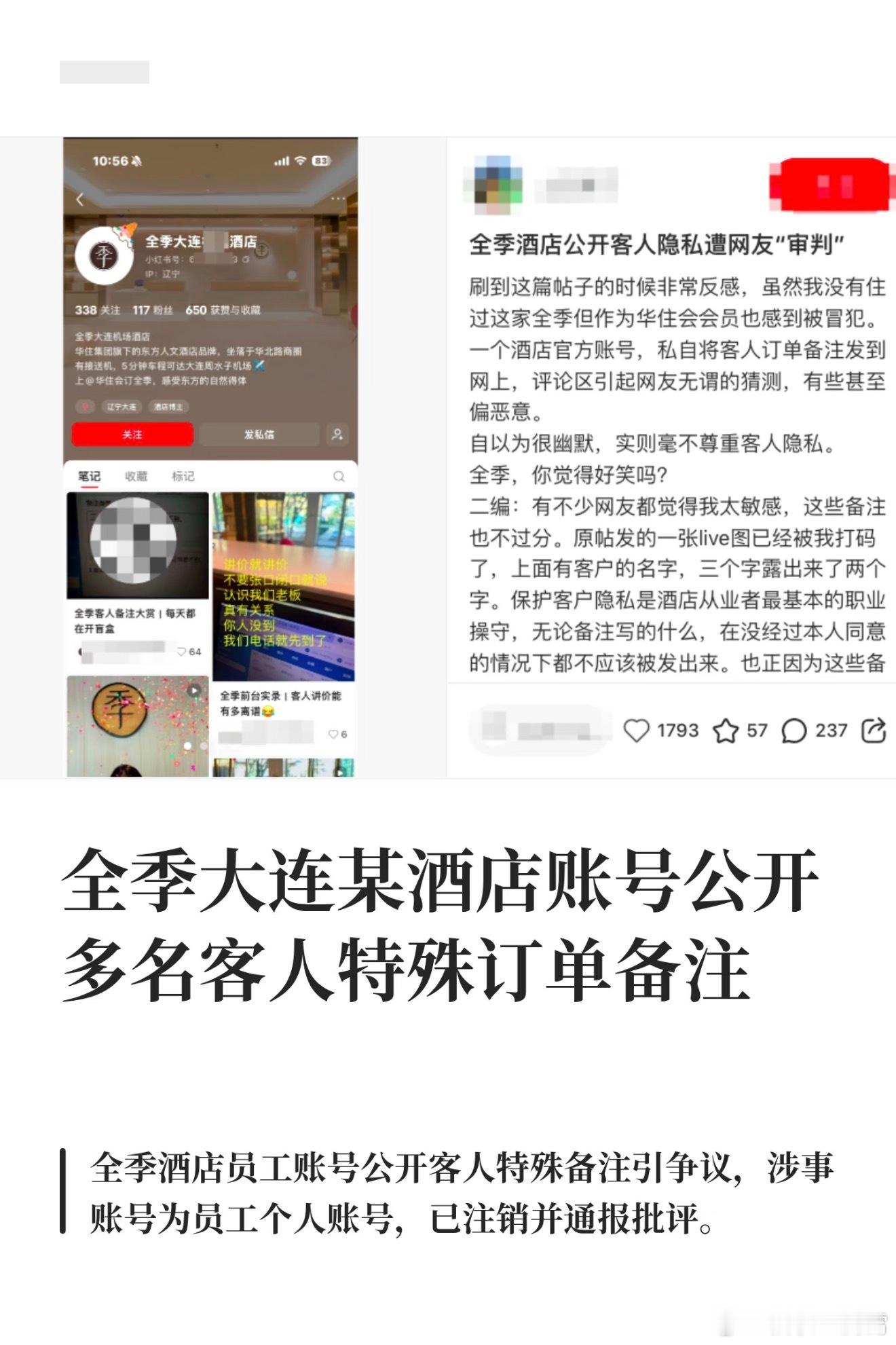 酒店订单备注玩梗被指侵犯隐私看了下细节,大连某全季酒店发了篇名为“全季客人备注大赏”的笔记,里面把很多客人的特殊备注给公布了出来,号主觉得很搞笑。但我觉得并不好笑,尤其酒店这种场所,大家都极度重视隐私,一言不合就把客人隐私泄露出来,那这酒店以后还有人敢住?