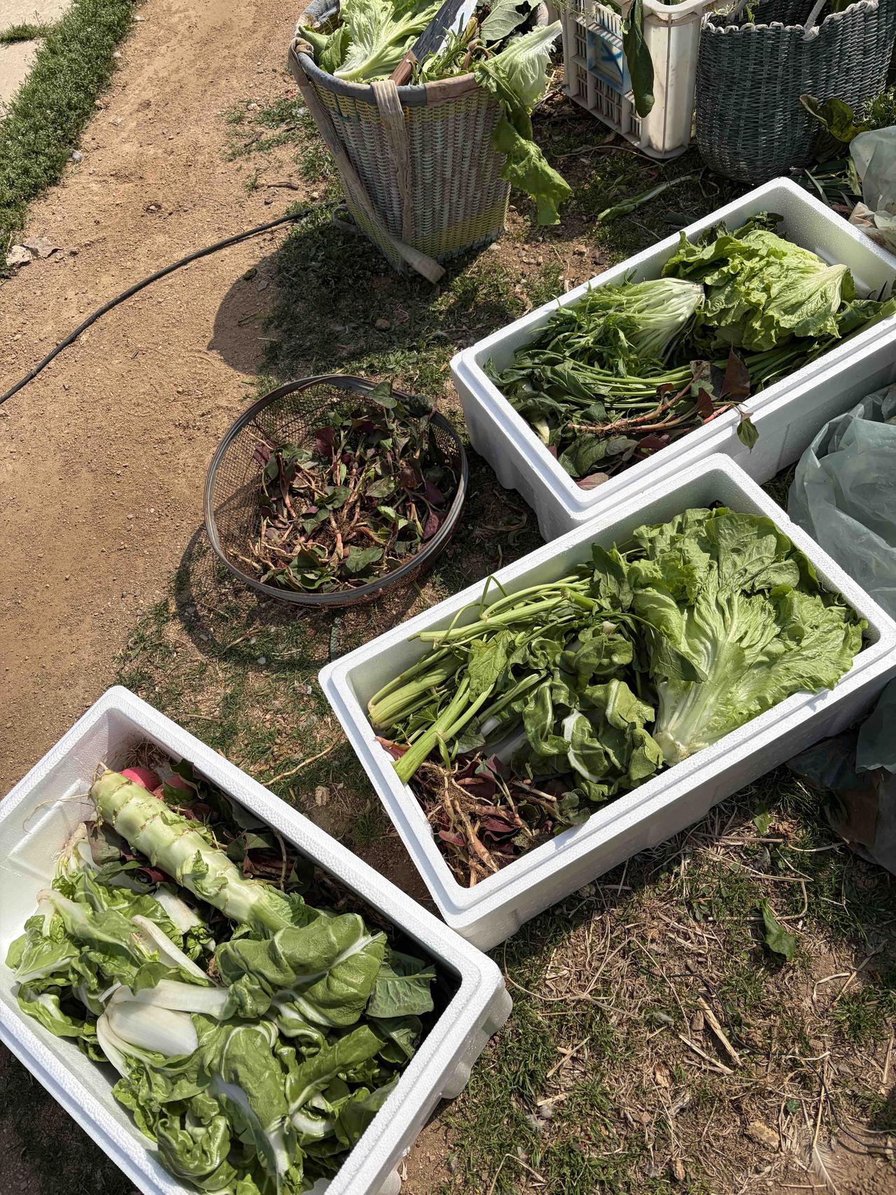 拔菜 搬菜 摘菜 装箱很麻烦,基本得花半天时间,除了看体力和心情,还要看好天气,忘了今天刮大风,帽子吹翻是小事,装菜的泡沫箱,如果周围没有障碍物,估计都能吹到海上。