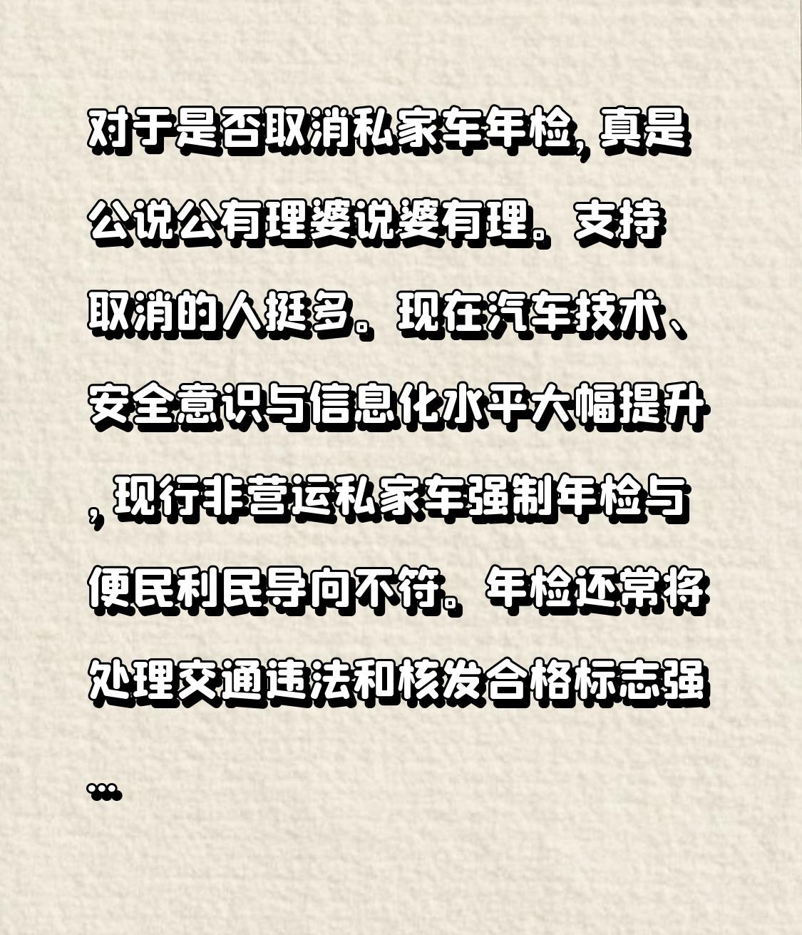 对于是否取消私家车年检,真是公说公有理婆说婆有理。