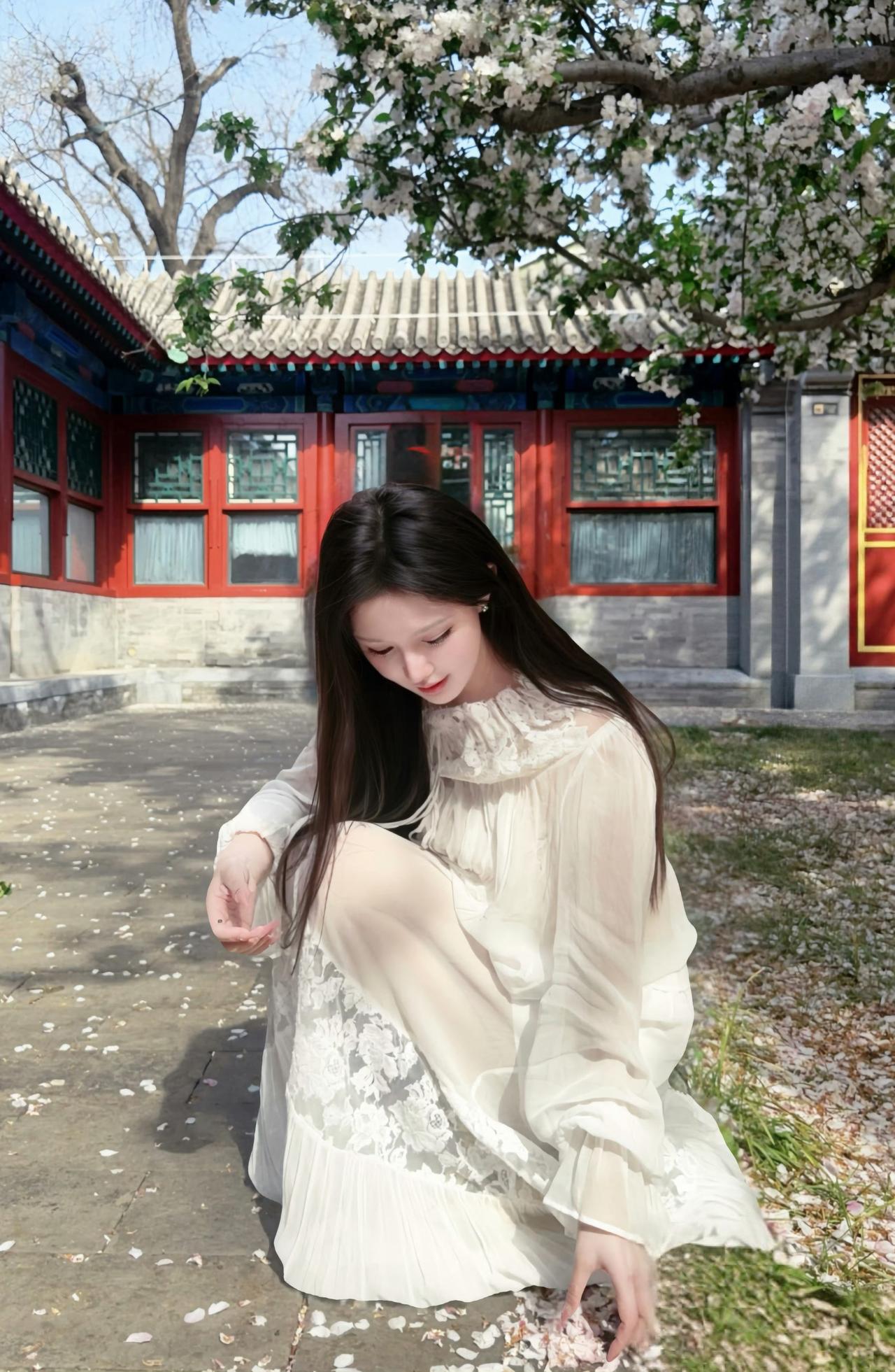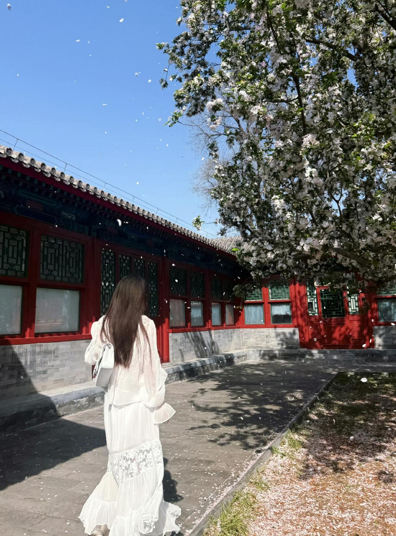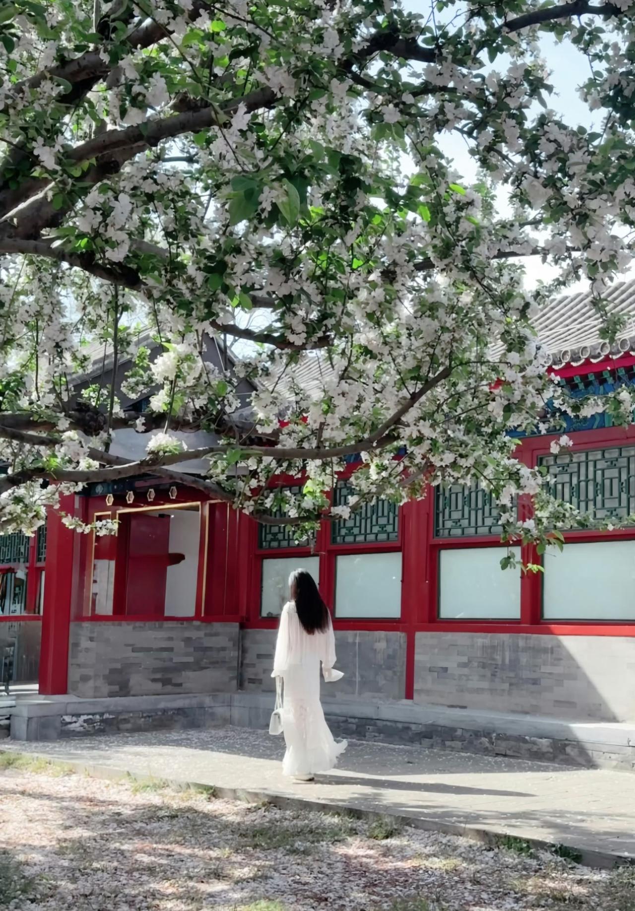 春日的风,把海棠花吹成了一场温柔的雪。一袭白裙轻晃,裙摆与落樱共舞,将春天的浪漫与温柔,都藏进了这方古意庭院里。