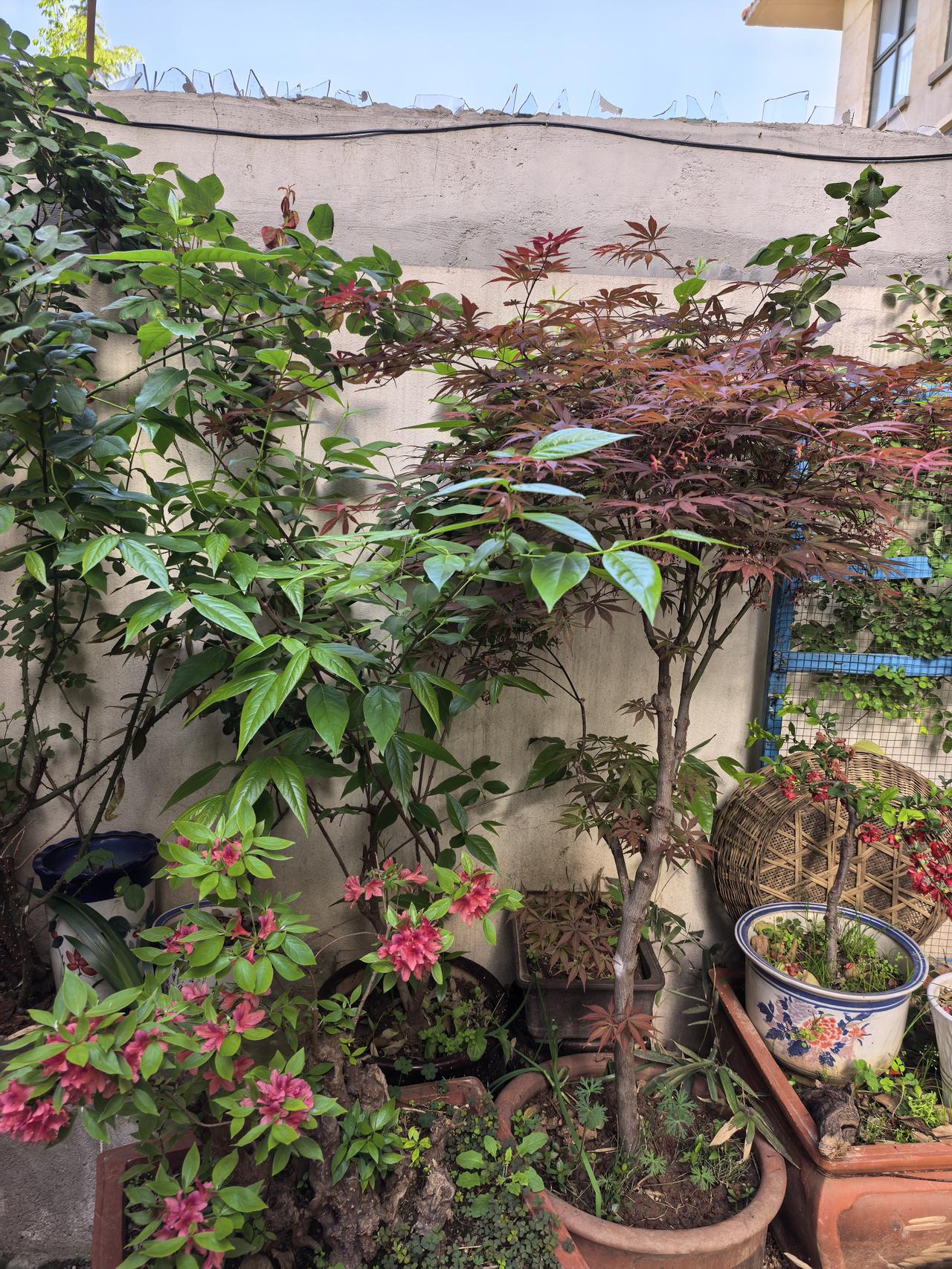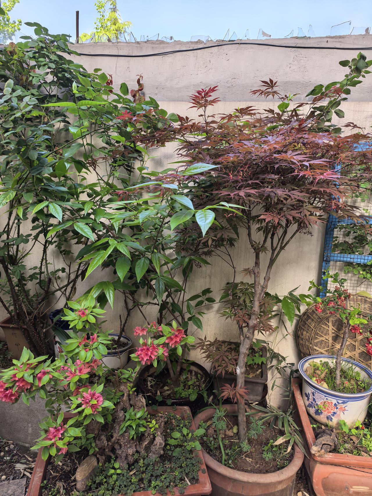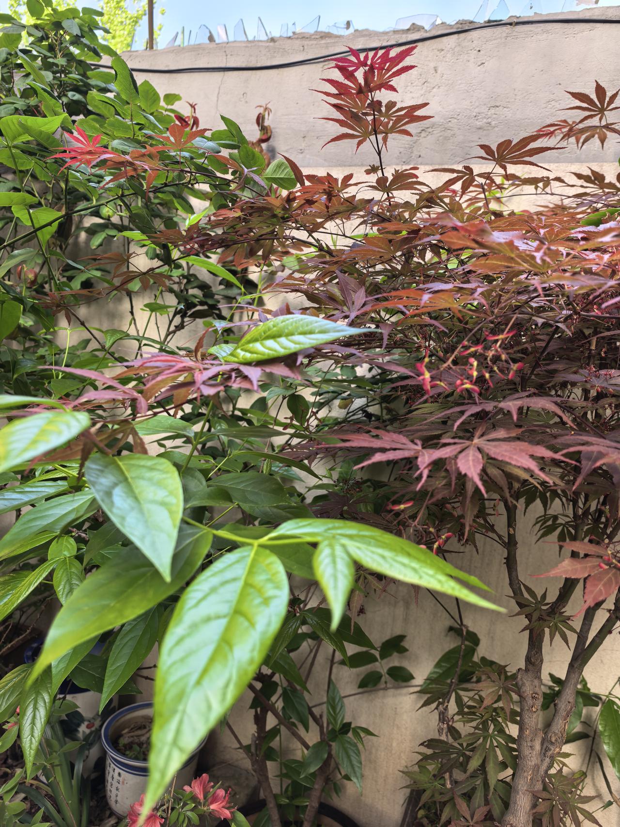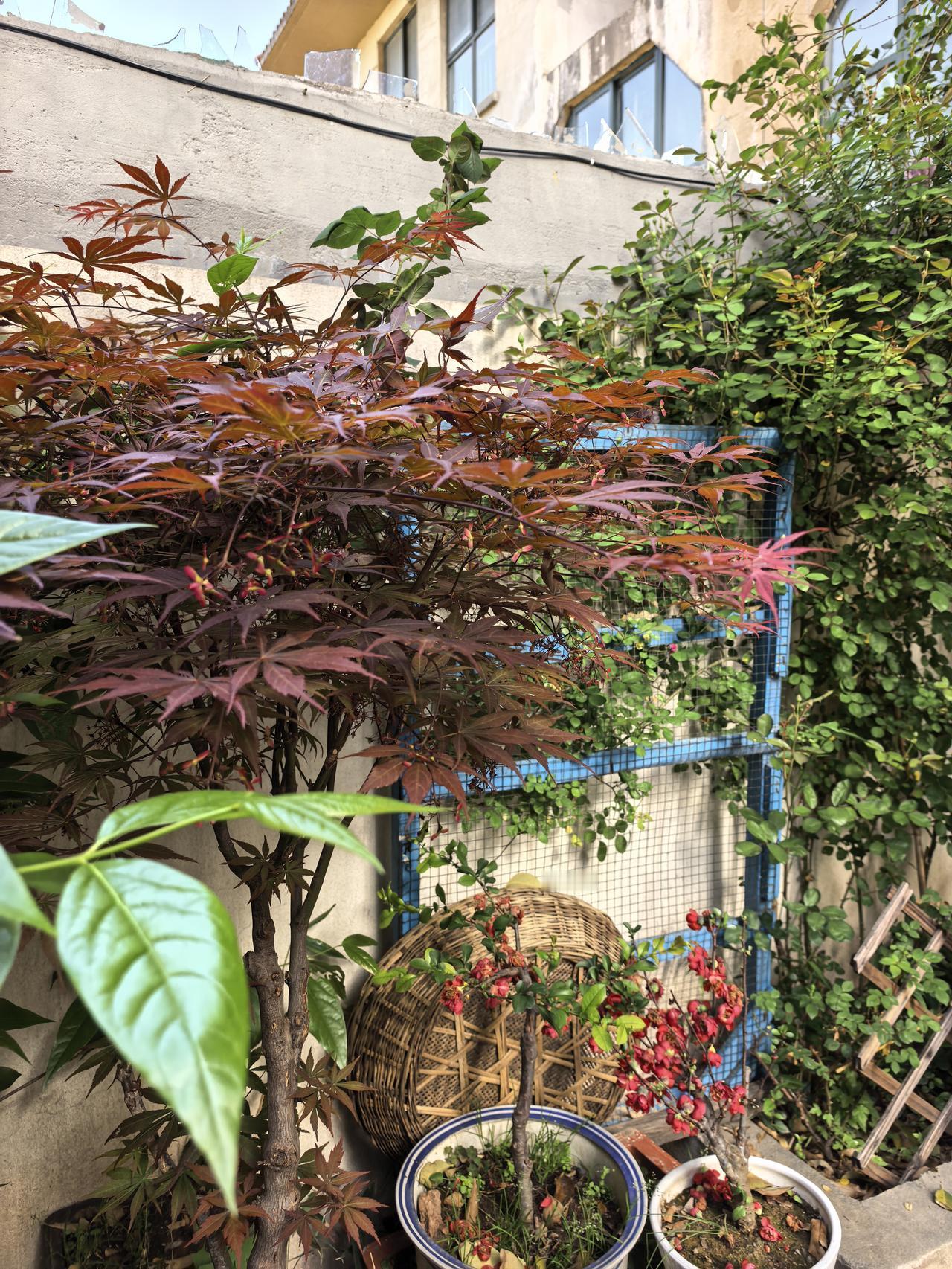 我的小院一角。红枫。 现在杜鹃花海棠花月季花玫瑰花牡丹花正在盛开。 原来红枫不仅