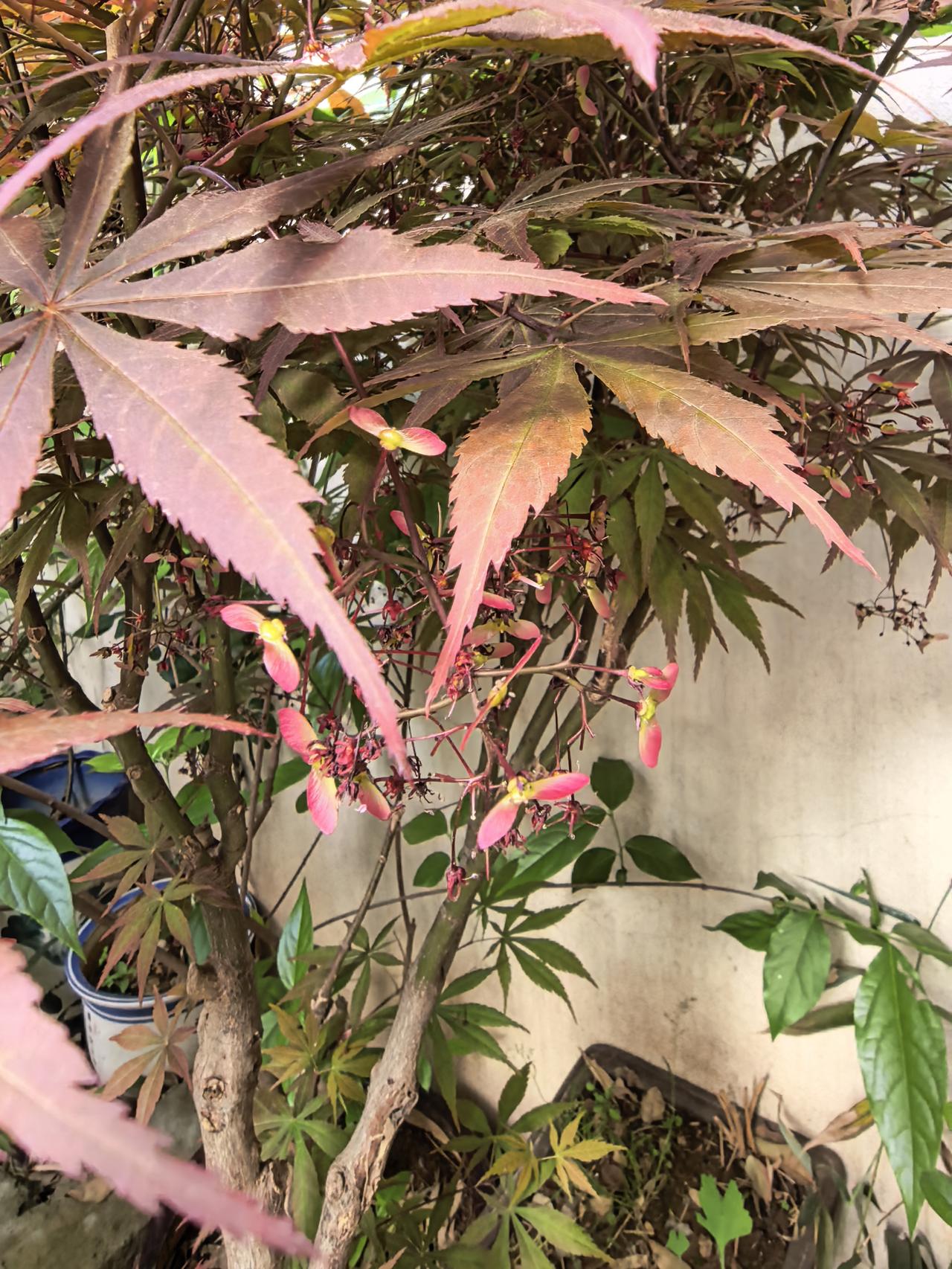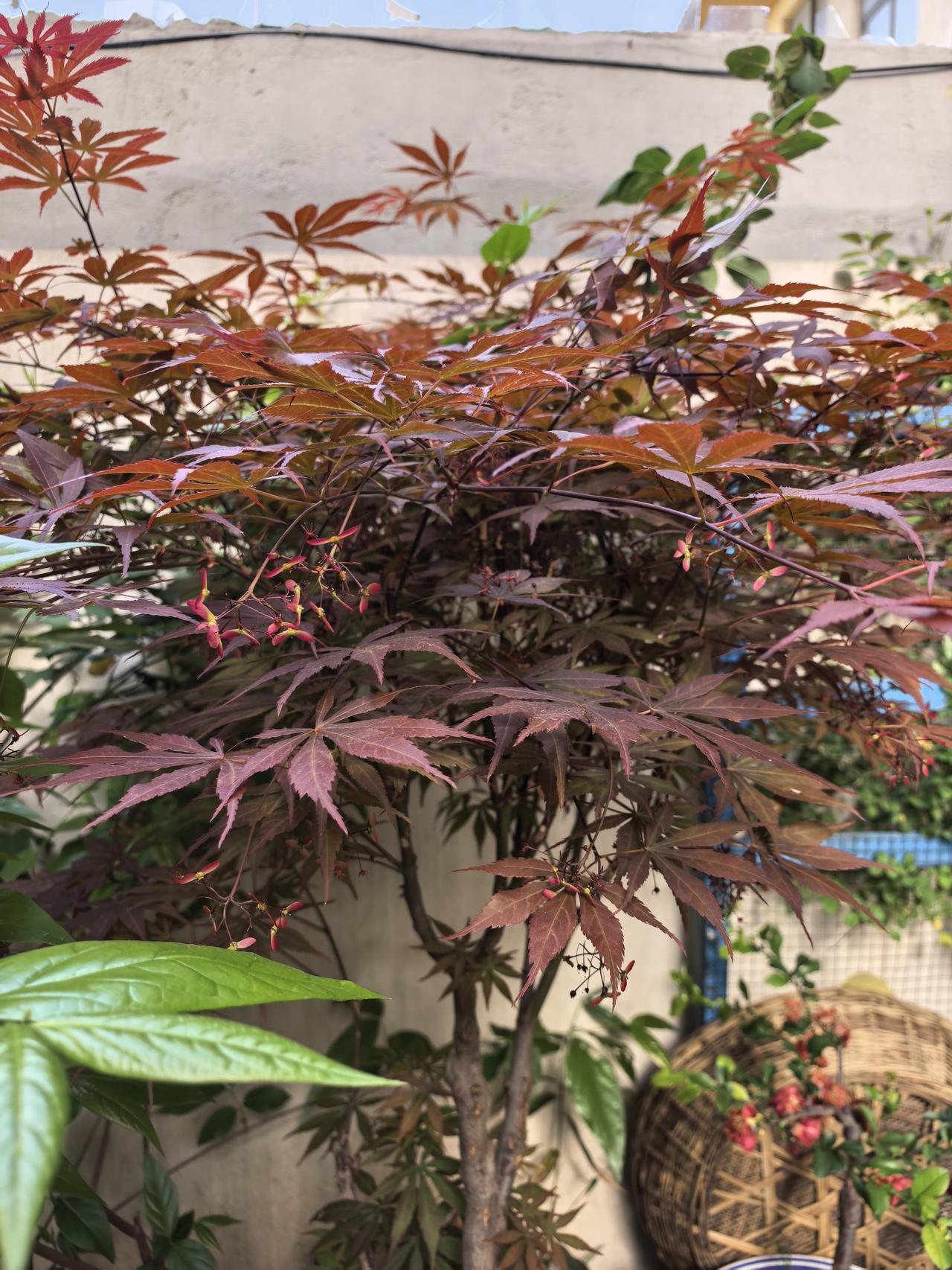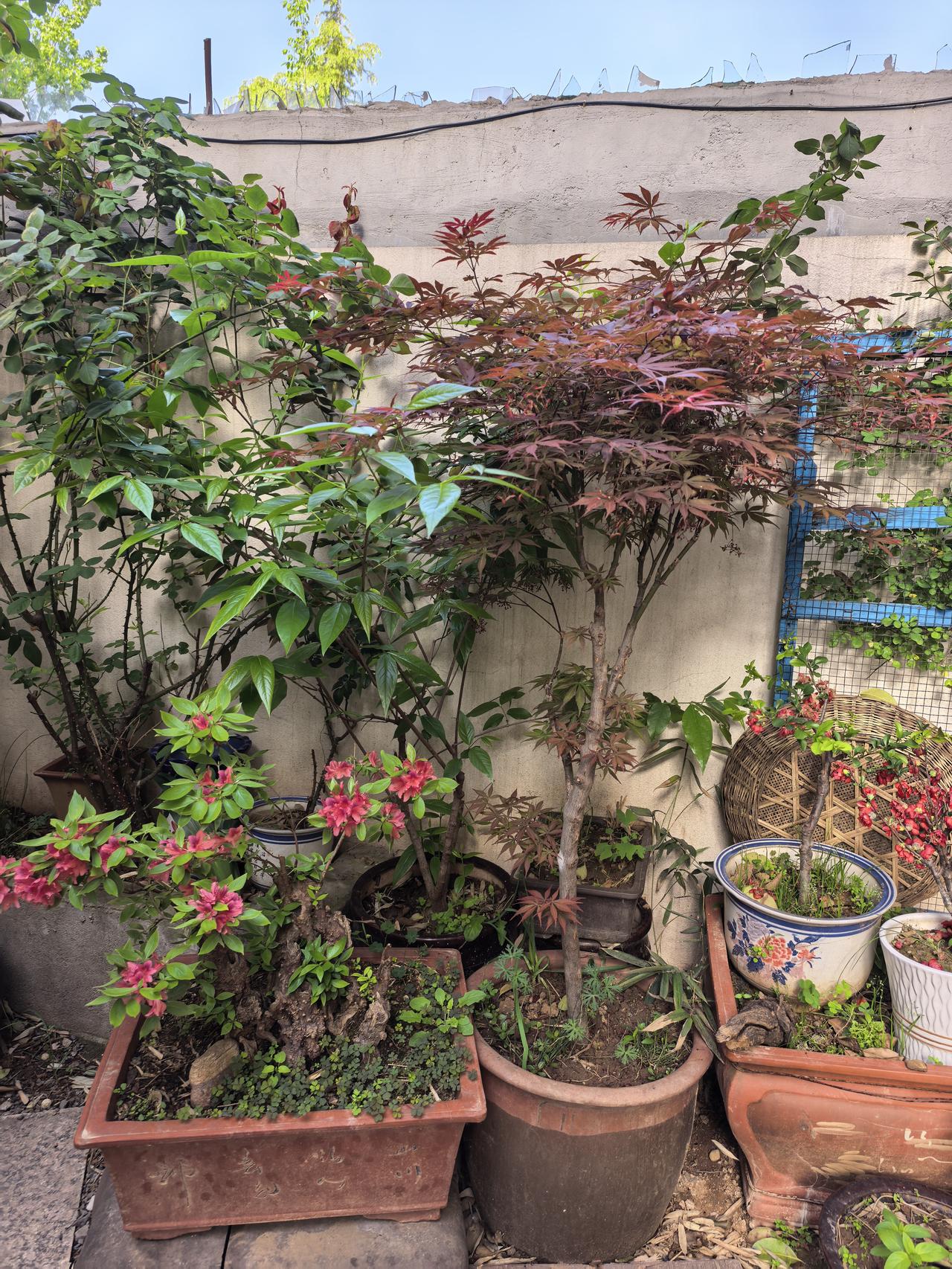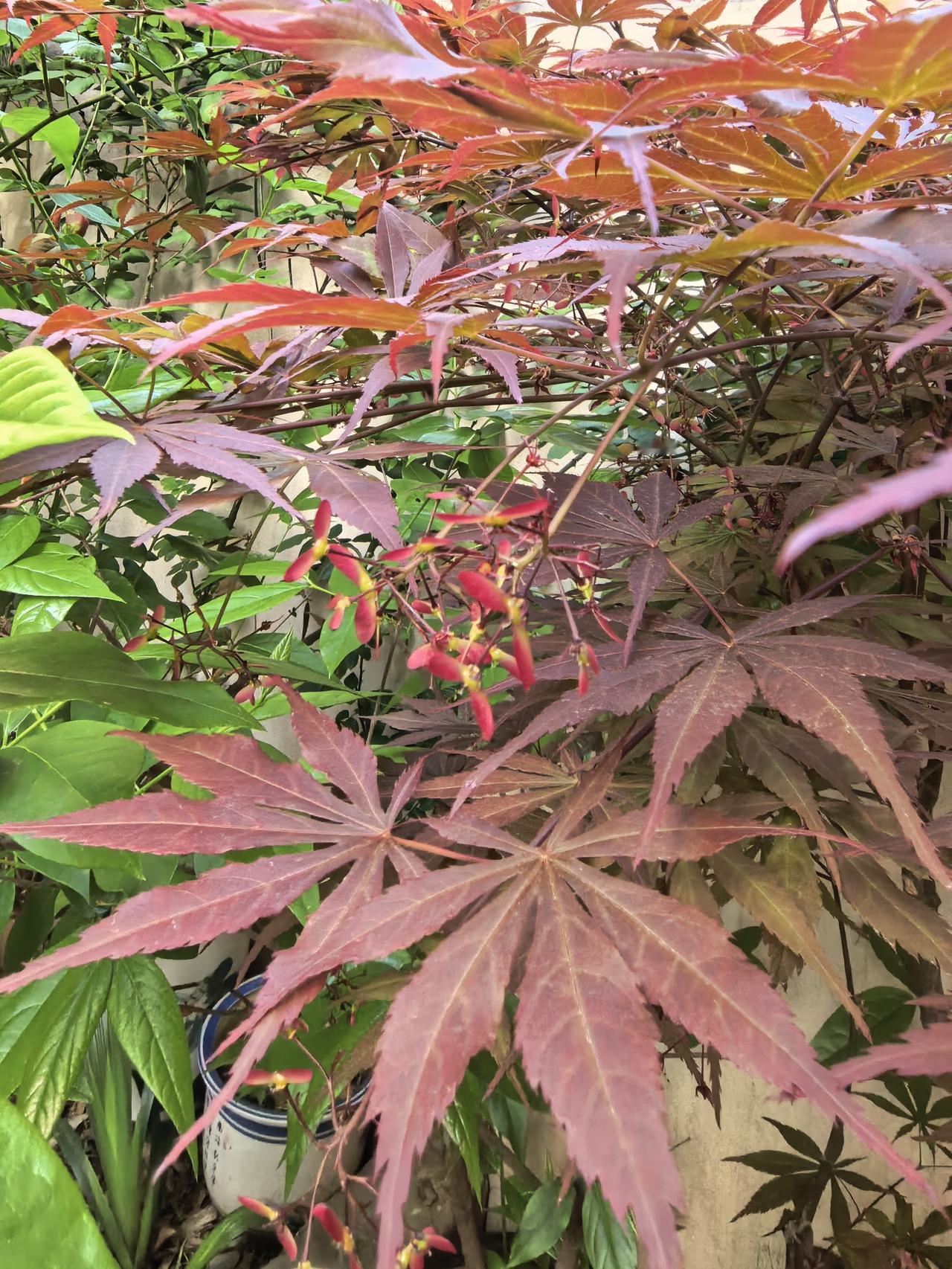 我的小院一角。红枫。 现在杜鹃花海棠花月季花玫瑰花牡丹花正在盛开。 原来红枫不仅