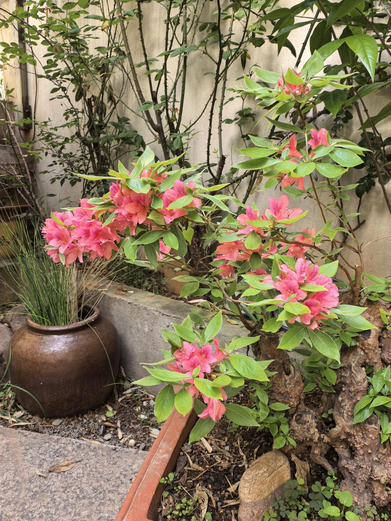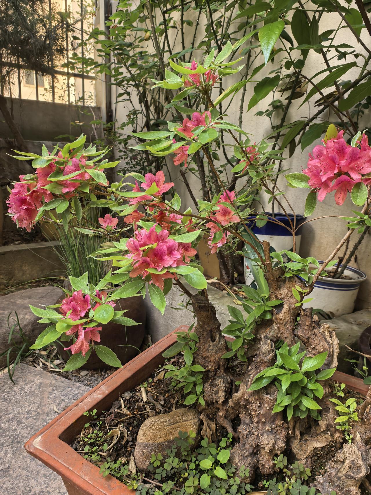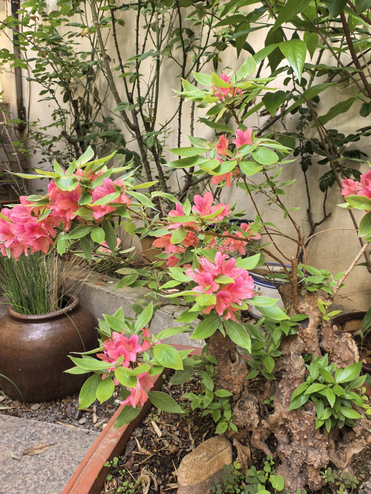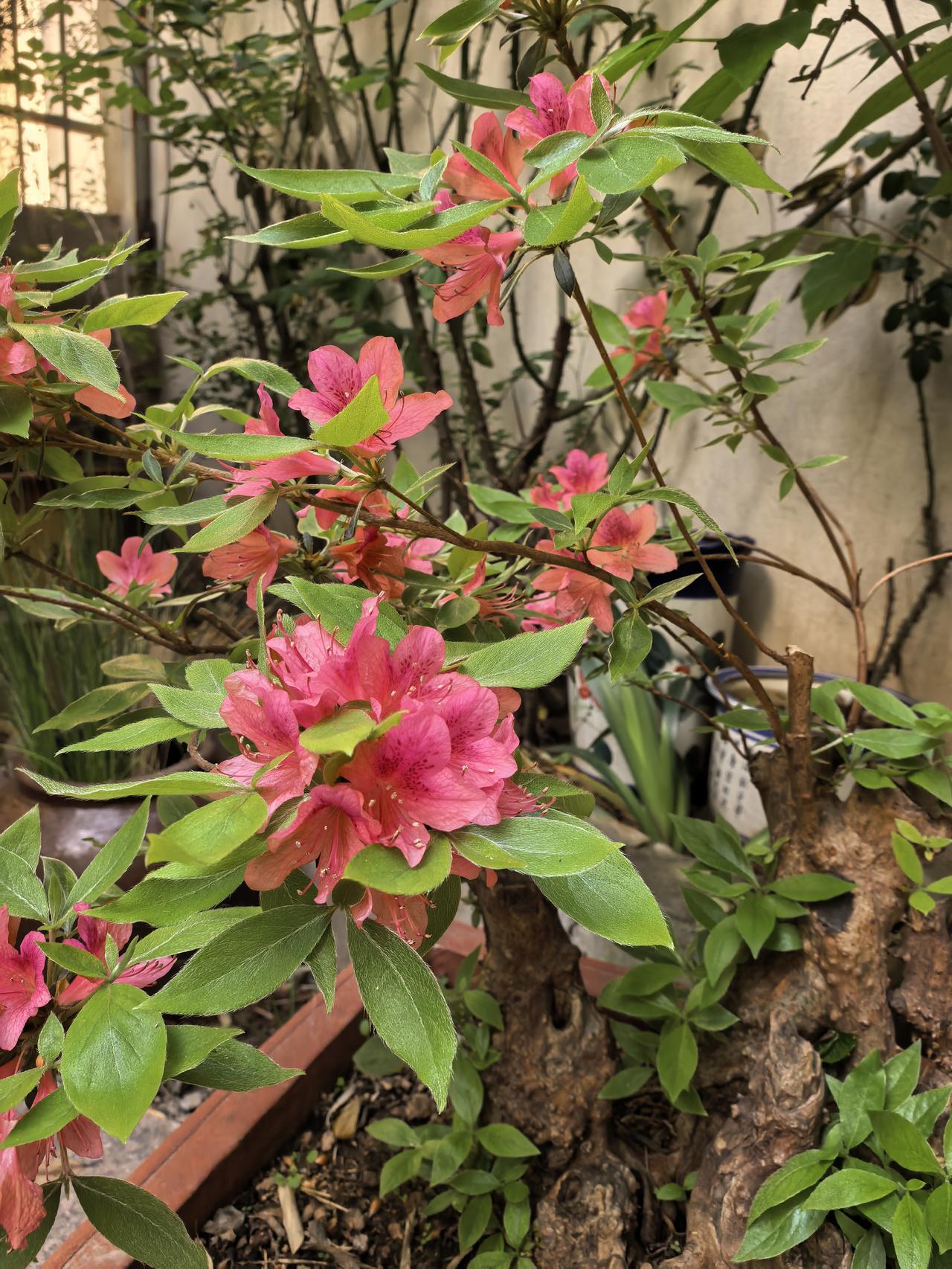 我的小院一角。红枫。 现在杜鹃花海棠花月季花玫瑰花牡丹花正在盛开。 原来红枫不仅
