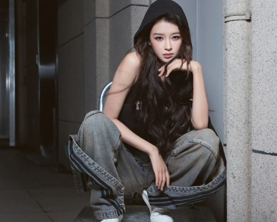 照片里孙怡走的是街头潮酷风:露肩连帽黑T搭着侧边拼接的阔腿牛仔裤,一头长卷发松松散散披下来,蹲在楼道的金属平台上,背景是冷调水泥墙,完全没有女明星拍大片端着的架子。最绝的是她稳得一批,不管是双手搭膝盖、撑着胳膊歪头,还是最后比着“嘘”的手势,脚后跟都稳稳贴在地面,整个人蹲得放松又舒展,一点都不晃。