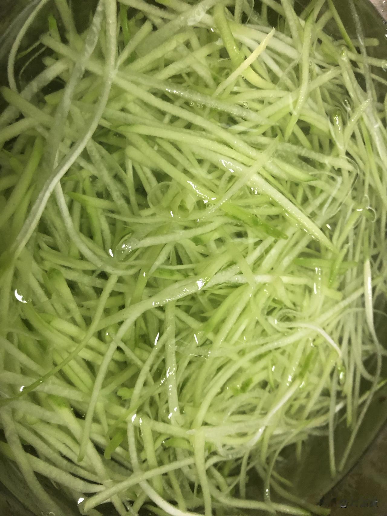 佛手瓜削皮切成丝,清水泡十几分钟,再洗两遍,开始凉拌。