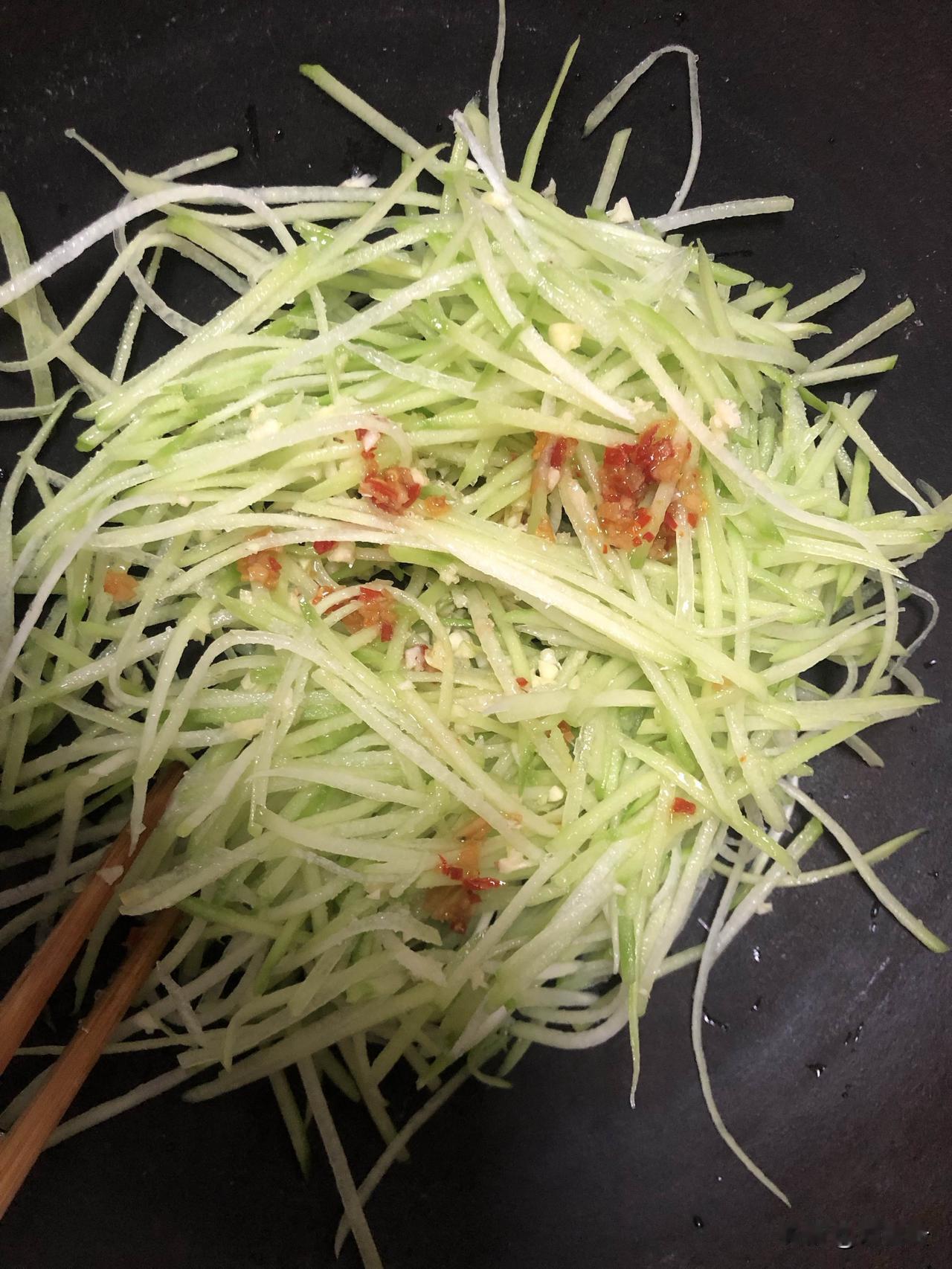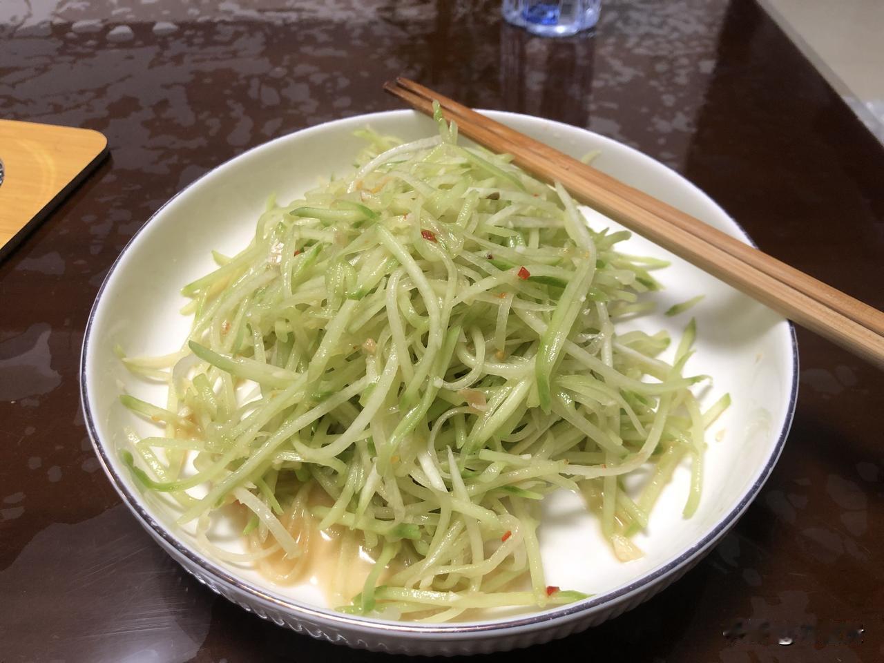 清水淘洗过的佛手瓜丝,控干水、加蒜末、料油,少许盐,少许白糖,少许味精,醋少许,随便搅拌一下,好吃的不得了。
