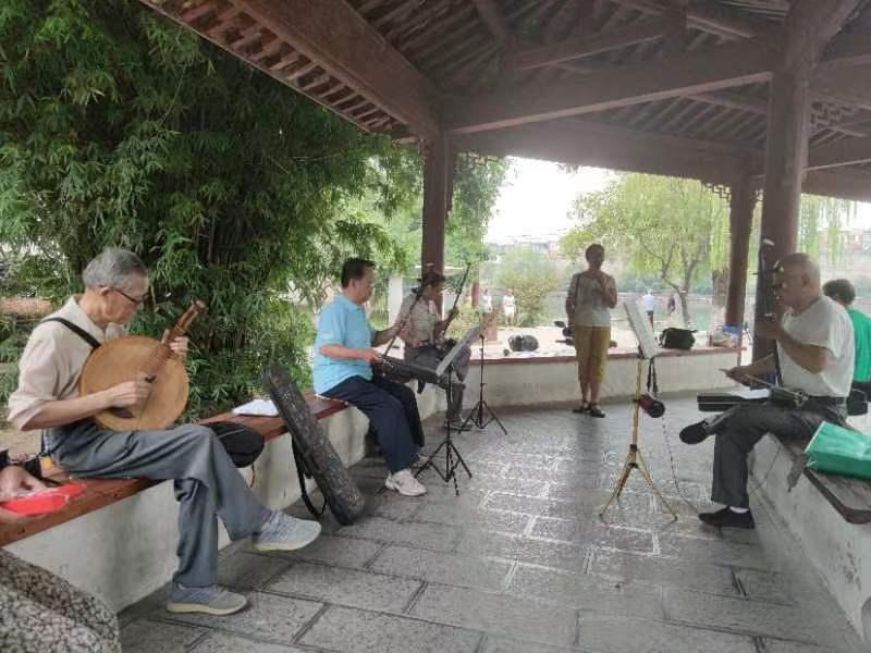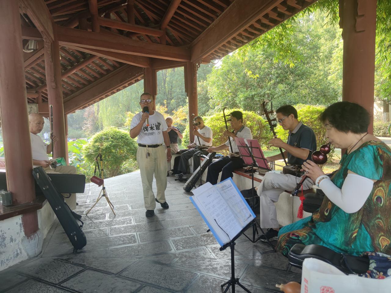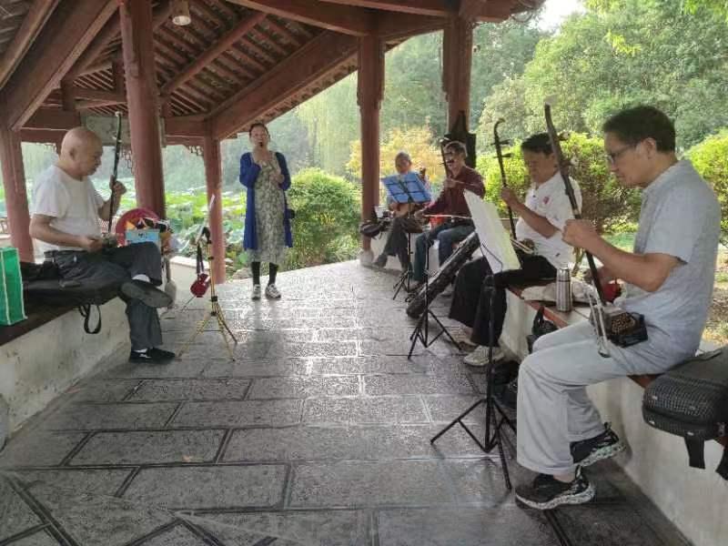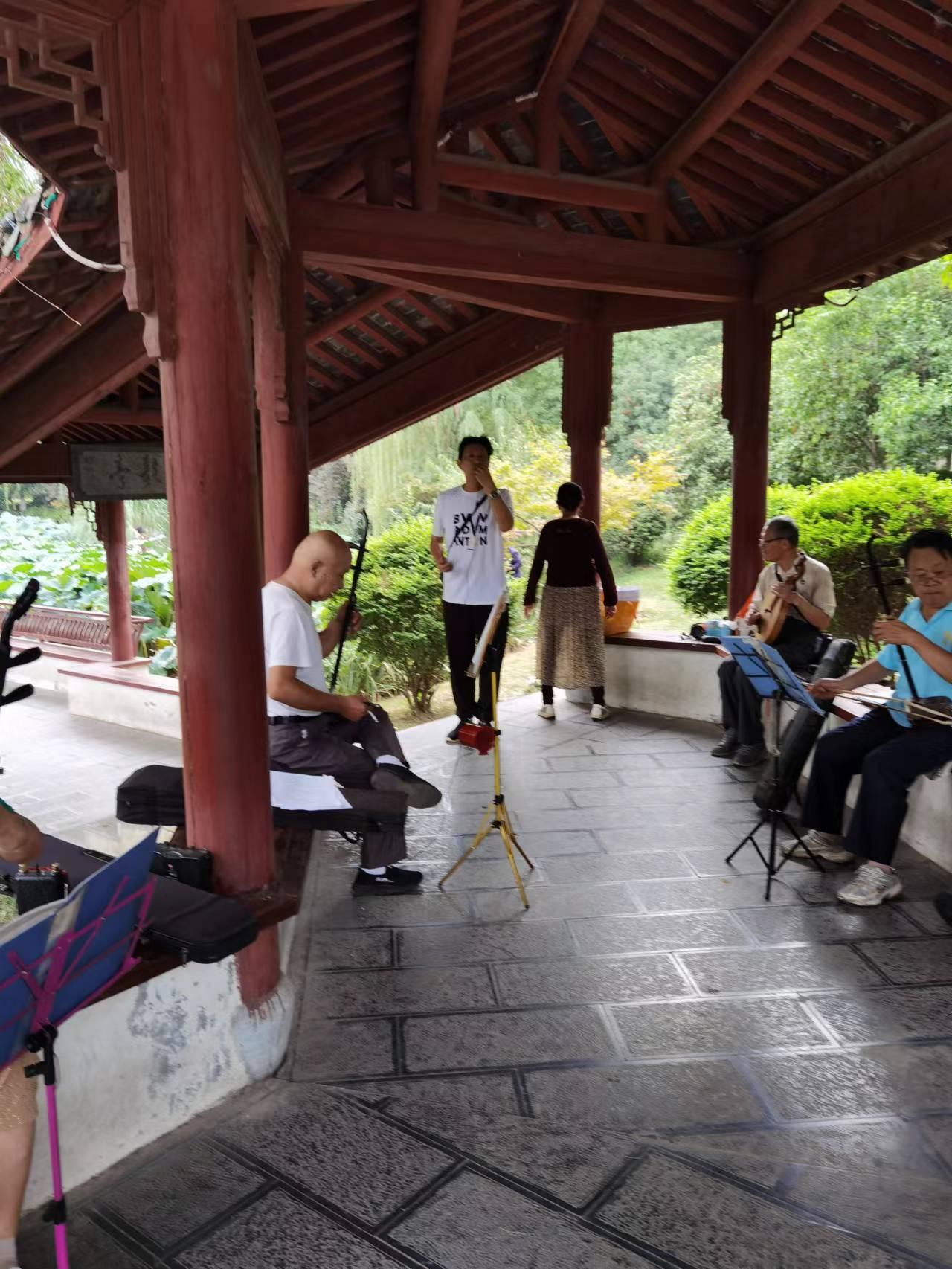 是啊,18年前当我们刚成立南湖之星艺术团的时候,天歌亭就是我们的舞台,不论天晴,下雨,六月天还是冰雪天,我们都会聚集在这里拉琴唱歌,好不热闹。18年前我刚50多岁,我们这一批人都还年轻,即使下大雪,我们买了红色的塑料布把亭子围起来还是继续唱。