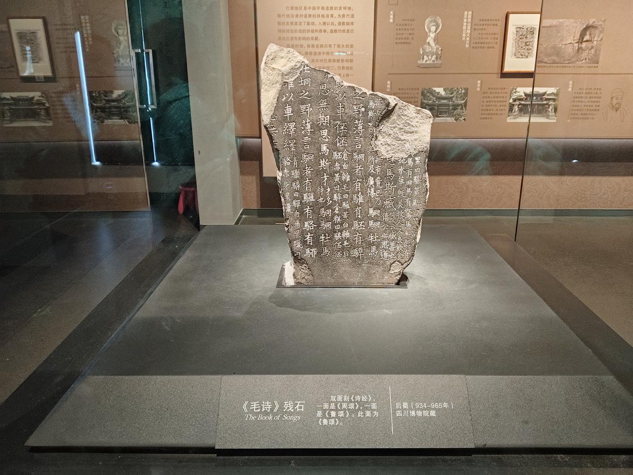 四川博物院馆藏文物多达36万多件,其中一级物1318件,二级文物5198件,位居全国前列,西南第一。四川博物院馆藏文物年代序列完整,特色鲜明,青铜、陶瓷、石刻、书画、民俗优势尤为突出。纹饰精美的《西周象首耳卷夔纹青铜罍》;四层画面的《战国水陆攻战纹铜壶》;灰谐生动的东汉第一俑《东汉陶说唱俑》;琴铭清晰的唐代《“石涧敲冰”七弦琴》;中国唯一带注文的儒家石经《五代后蜀残石经》;当前唯一完整的,王建墓出土的帝王和田玉带《五代云龙纹玉大带》;南朝佛像头、有东方美神之称,万佛寺出土的唐代观音菩萨石像等,都值得鉴赏。遗憾的是参观当天明、清展厅未对外开放,未能亲见描绘格萨尔史诗故事的清代格萨尔唐卡。