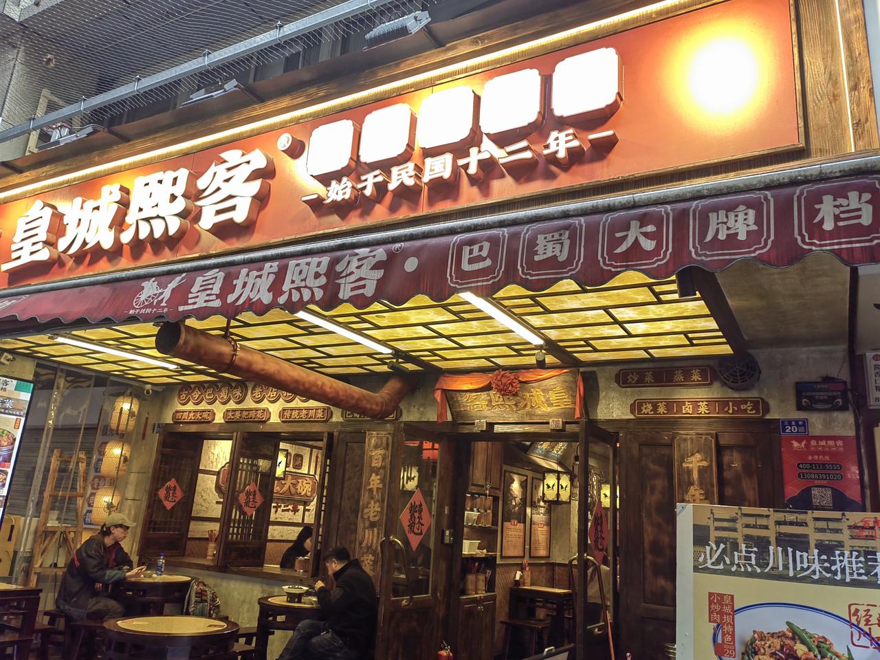 镋钯街经太古里舍,直行到底是食街。十字路口附近的三圣街2号皇城熙客,始于民国十二年,号称巴蜀大牌档,长于经典川菜和成都小吃。店不大,装饰较地道,较干净卫生,小份量菜品,味道还可以,值得品尝。