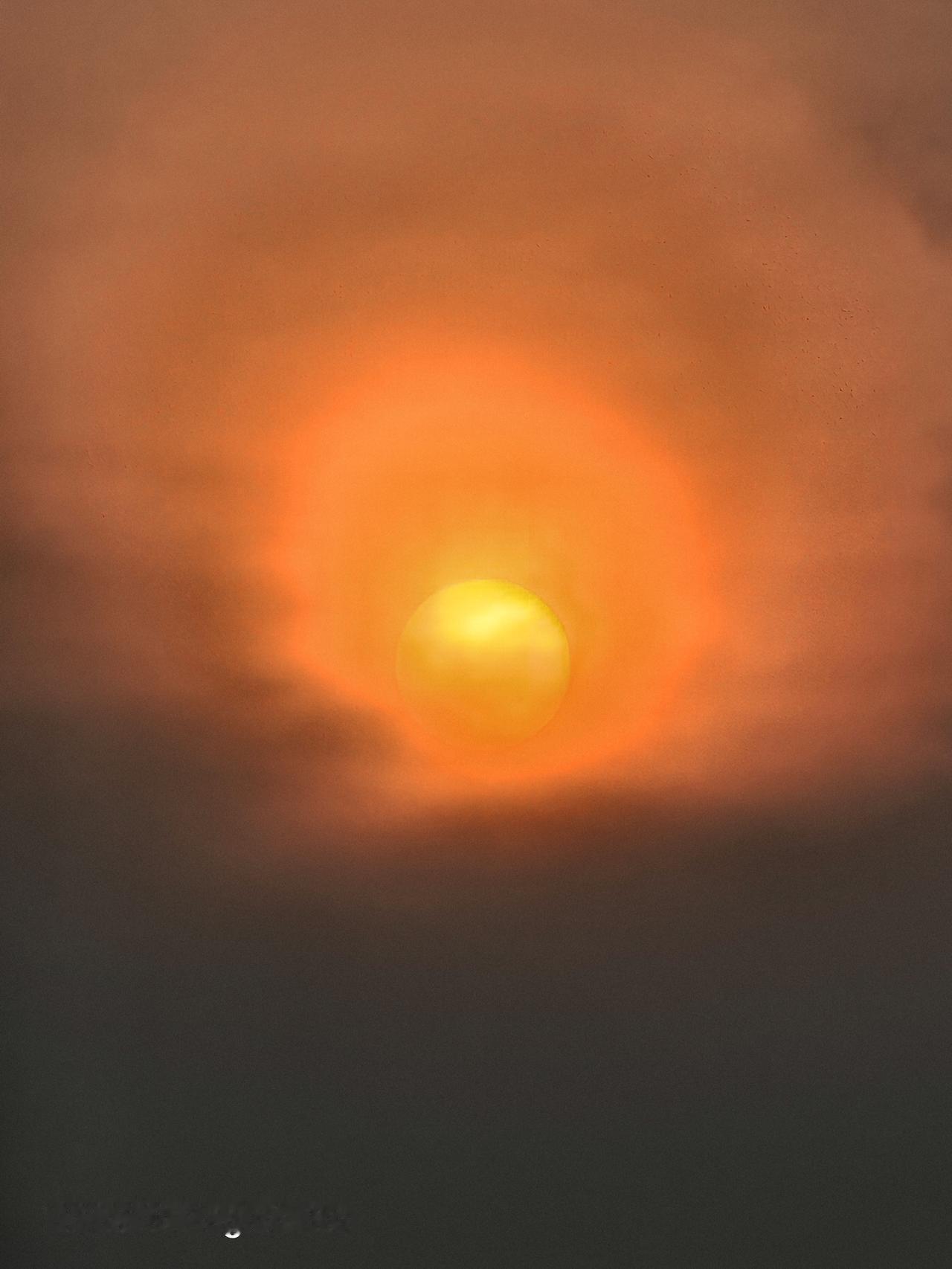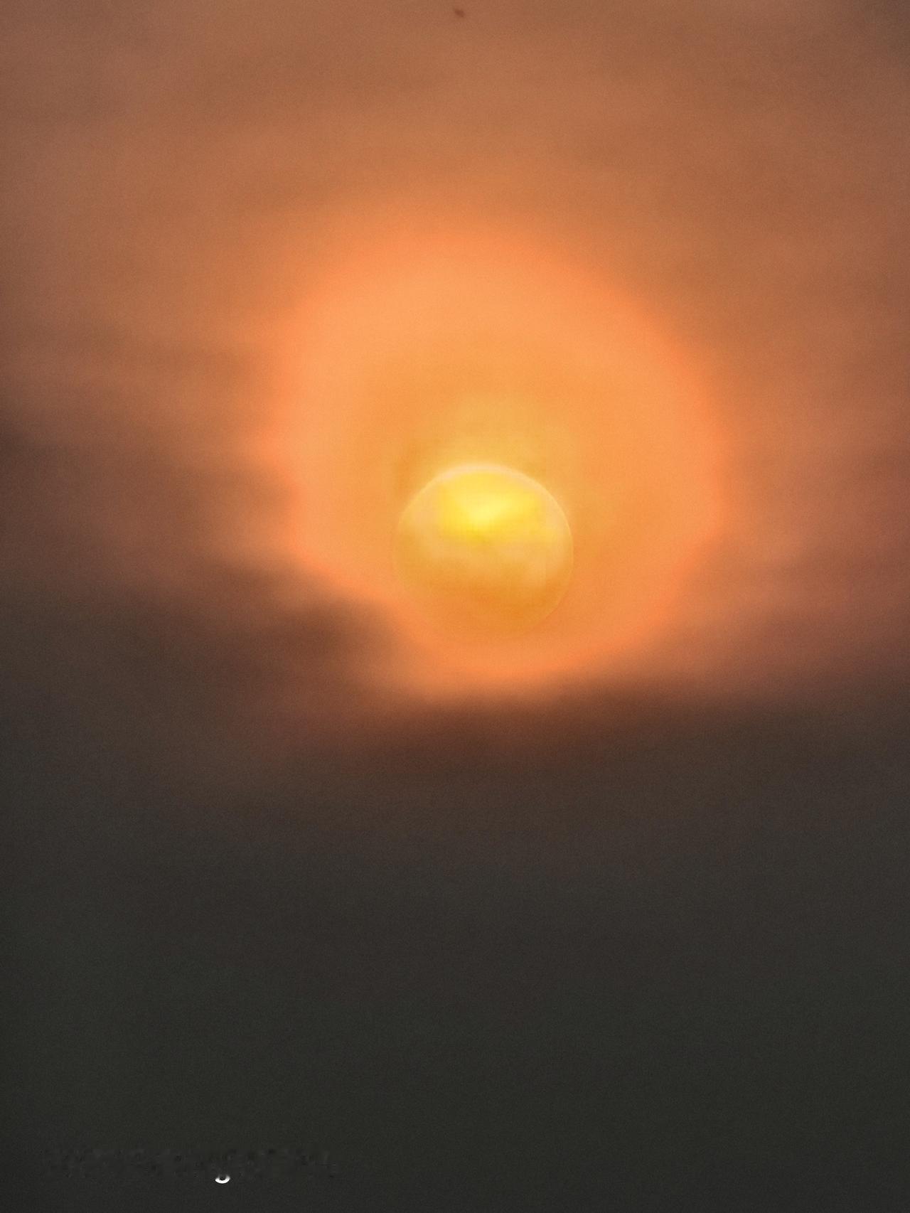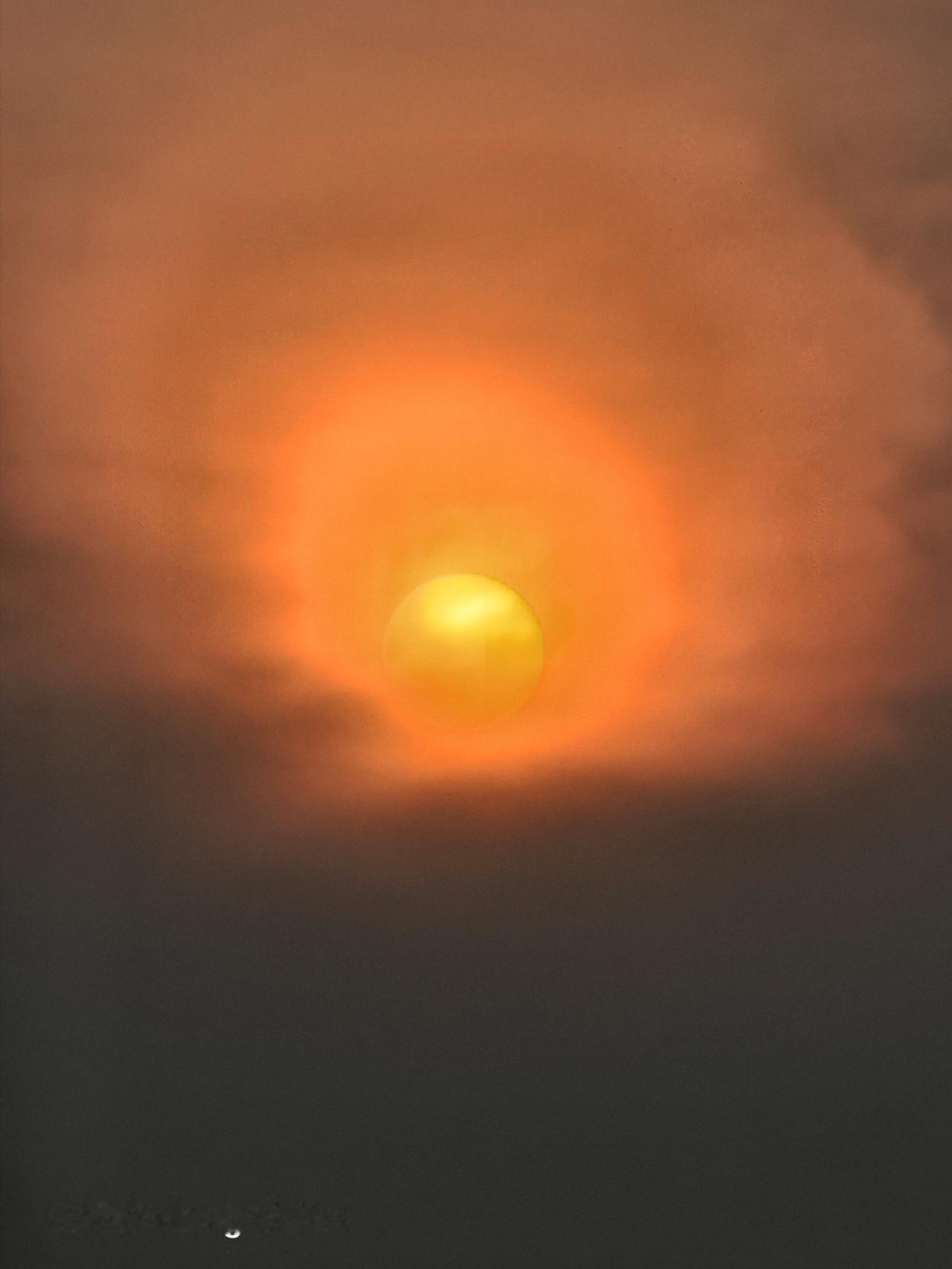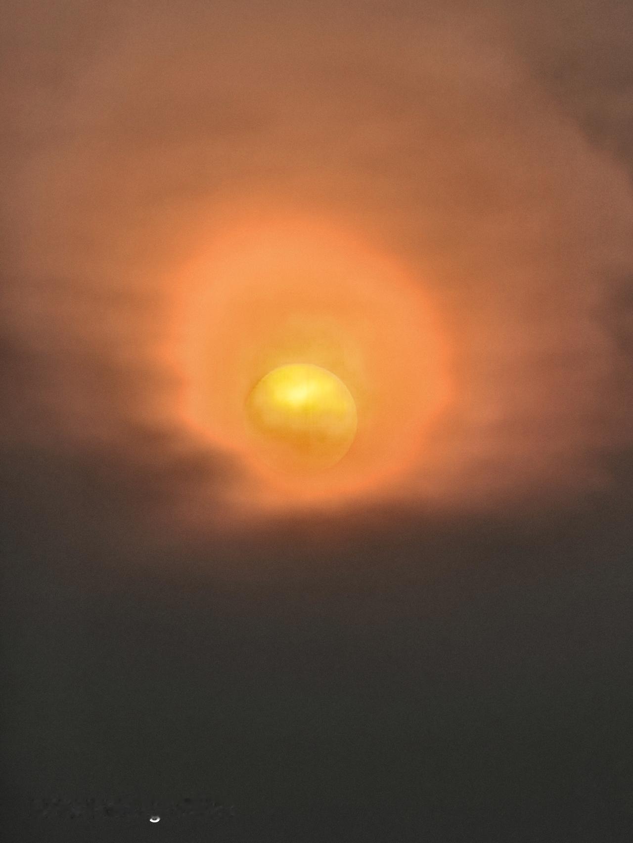 原本想象中那橙红色的太阳一点点沉入地平线,天空被染成绚烂色彩的画面没出现。阴天里,天空灰蒙蒙的,太阳像是被一块巨大的灰色幕布遮住,只透出微弱的光。