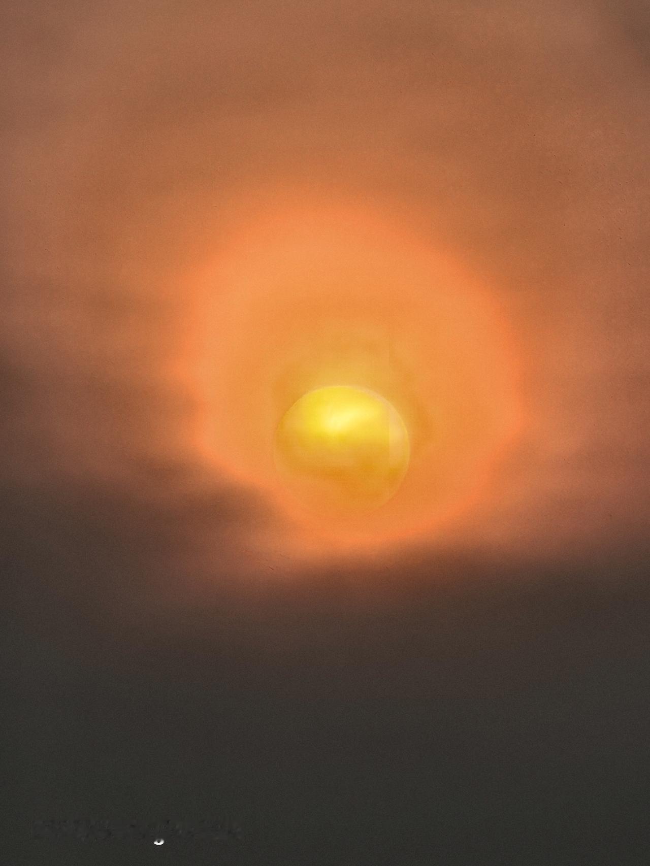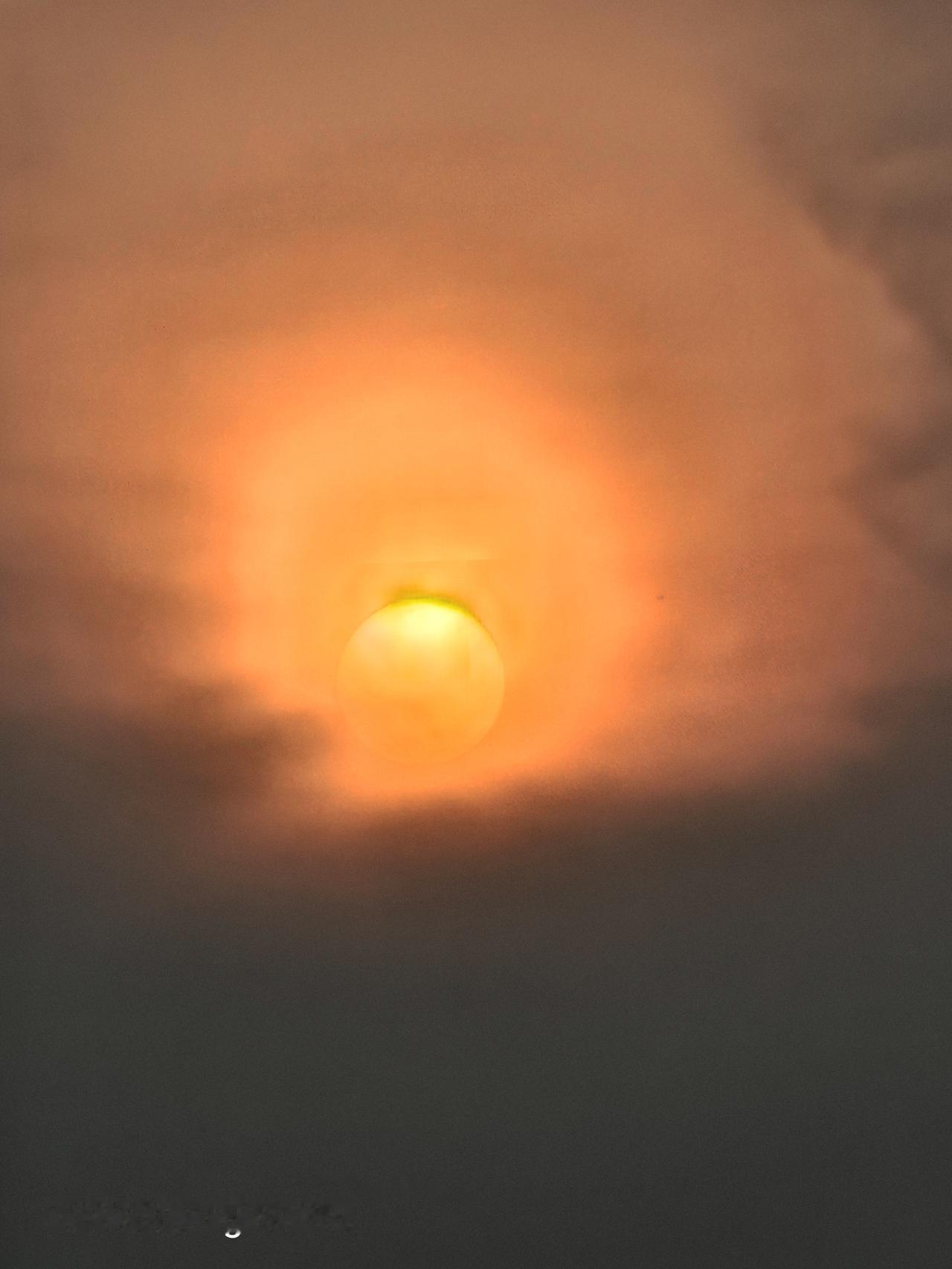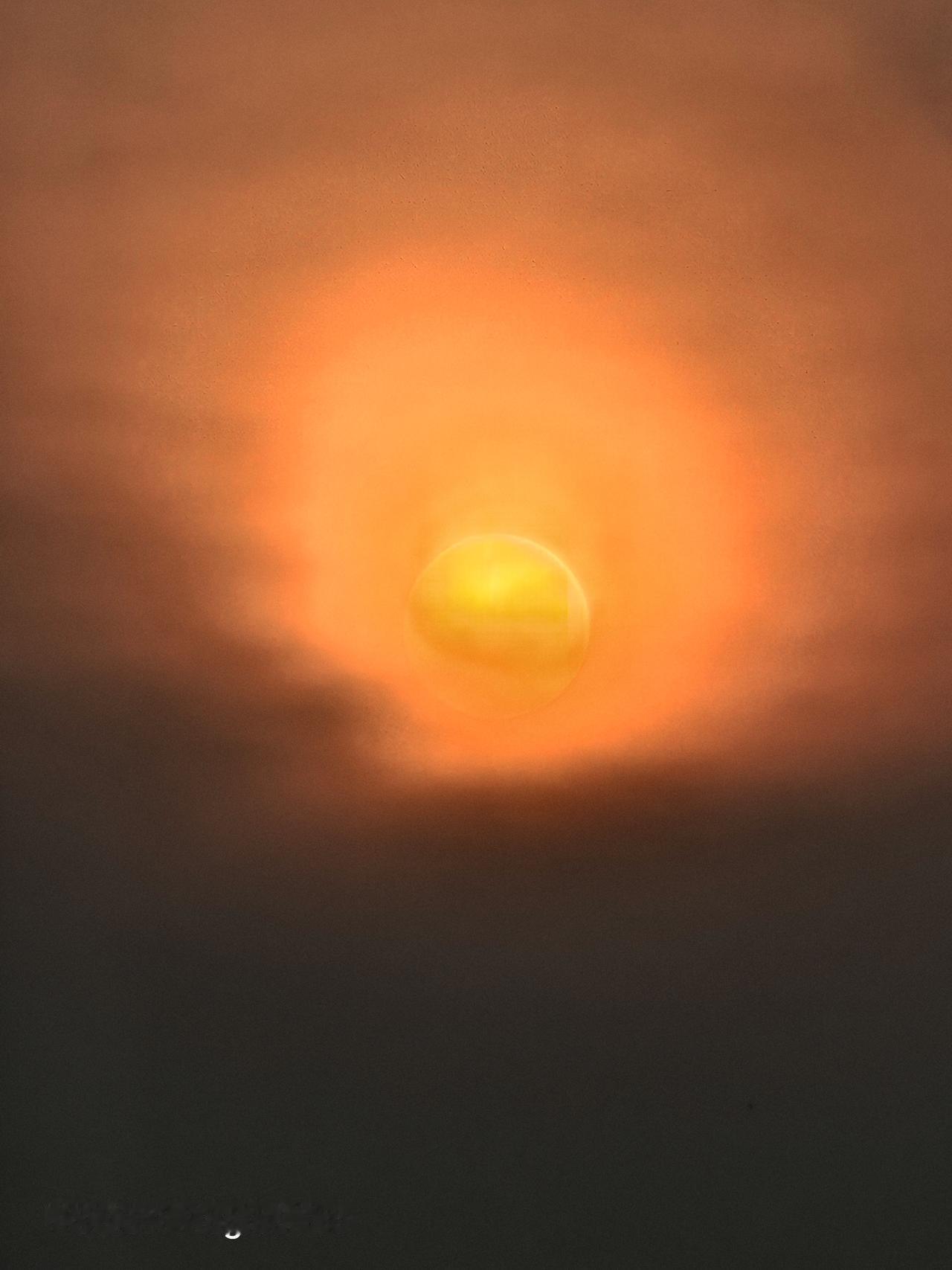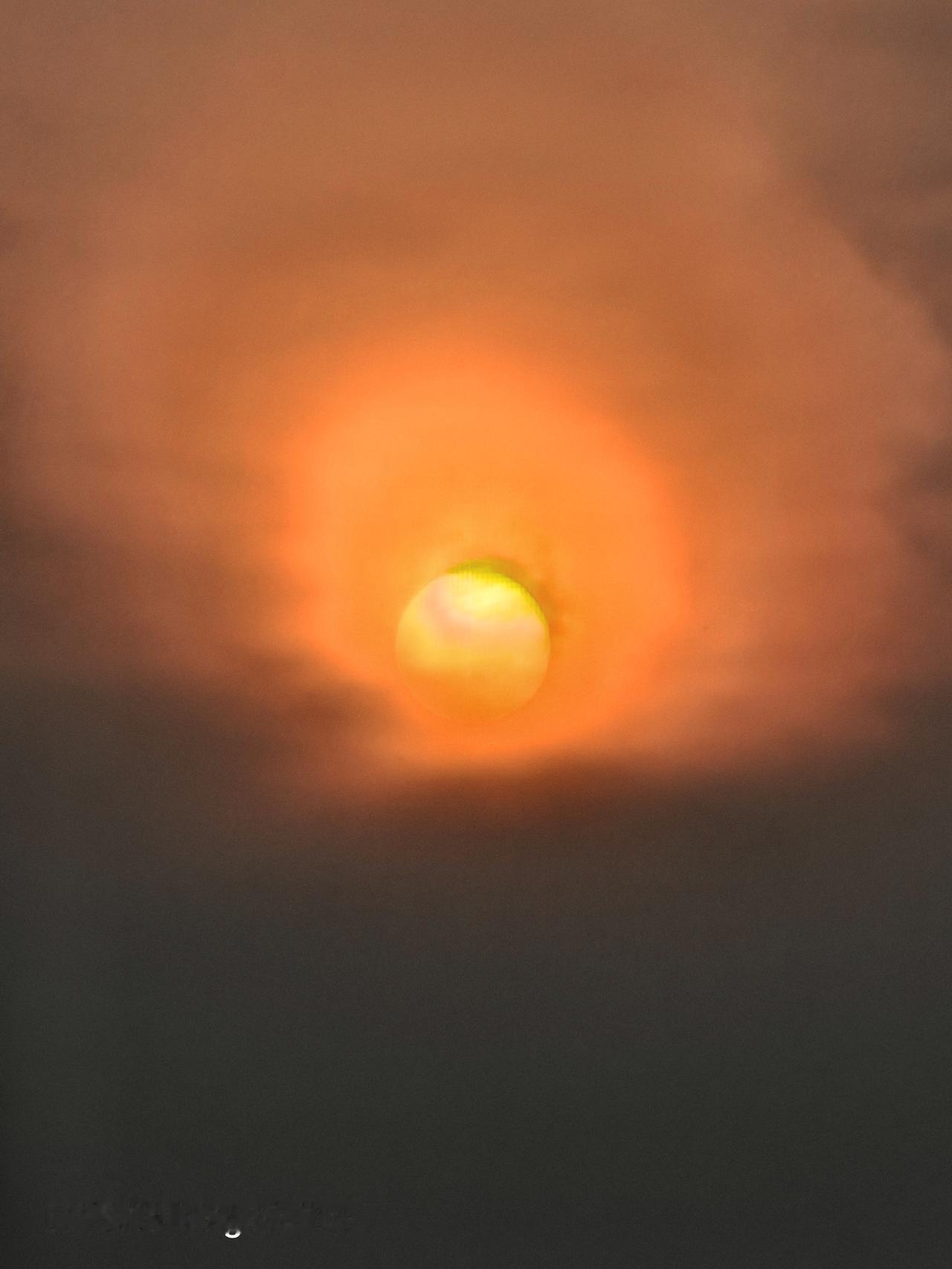 原本想象中那橙红色的太阳一点点沉入地平线,天空被染成绚烂色彩的画面没出现。阴天里,天空灰蒙蒙的,太阳像是被一块巨大的灰色幕布遮住,只透出微弱的光。