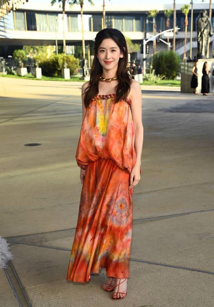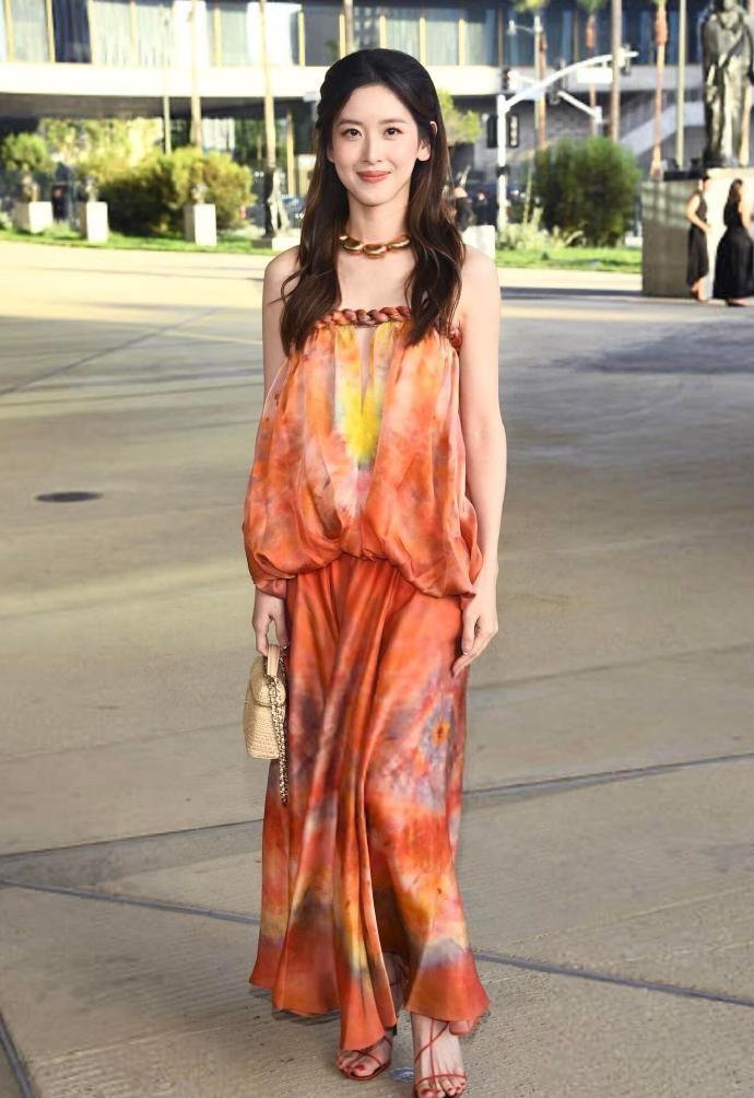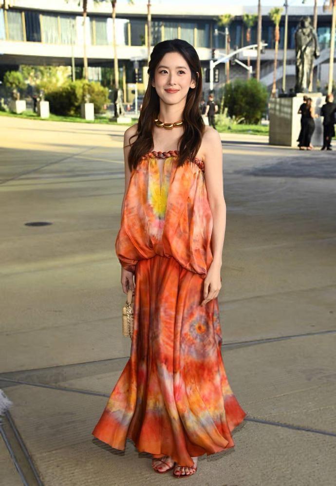章泽天穿的是一款漂亮的印染裙,穿上这件裙子之后能够让她秀出漂亮的香肩,气质超好。