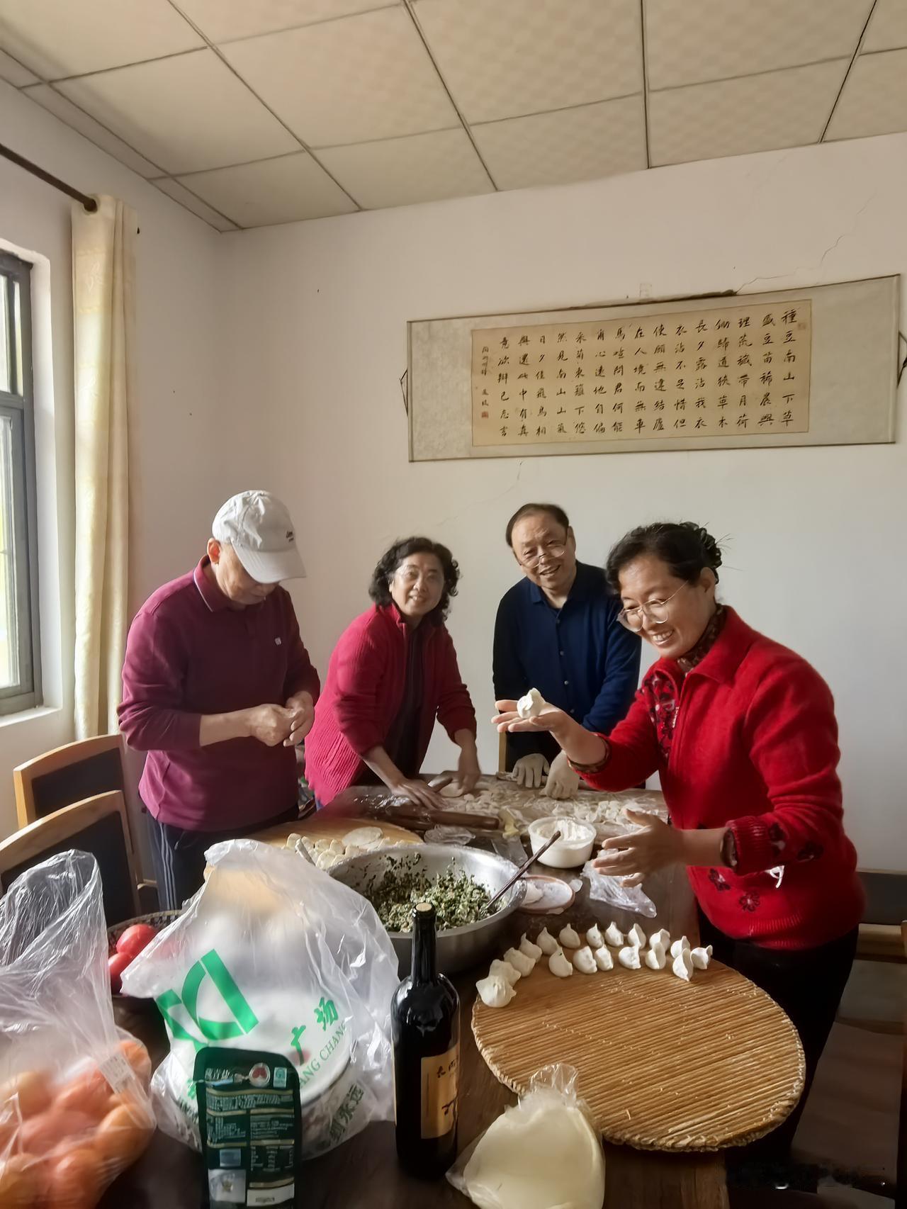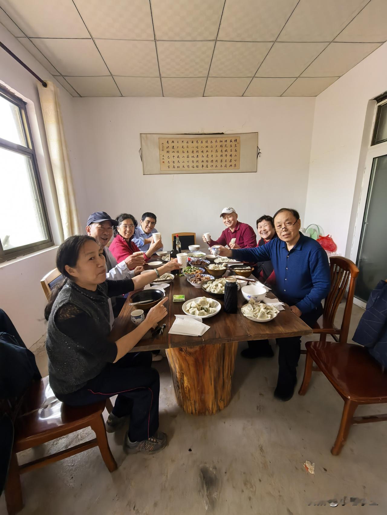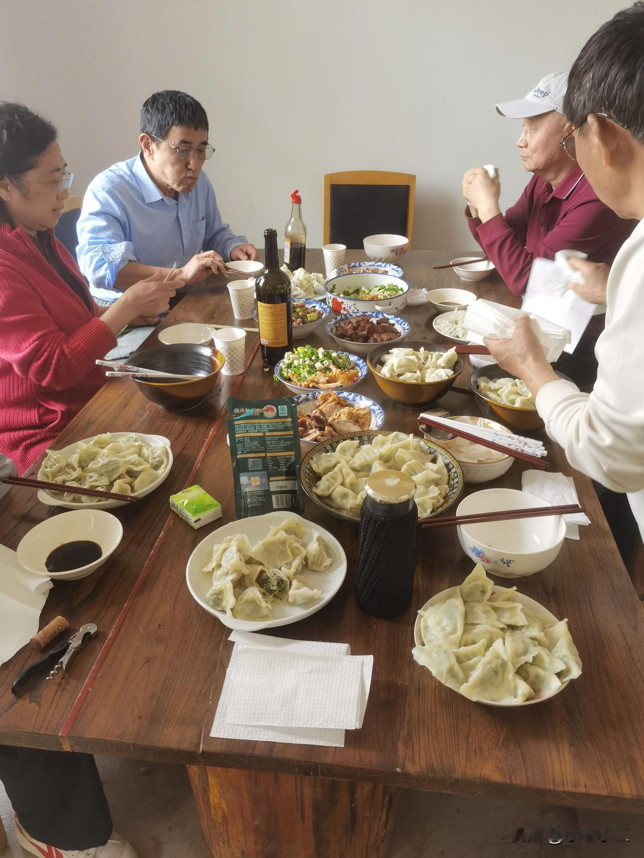 自产的韭菜,成就了午餐的美味。新春头茬韭菜,郁郁葱葱。镰刀落地,收获一大堆。韭菜鸡蛋,猪肉韭菜,两种馅料。全员动手,仅三十分钟,十个人的水饺就包好了。搭配,猪耳、酥鱼、小葱拌豆腐、瘦肉酱松茸、五香肘花、黄瓜花生米六个凉菜,斟满红酒,举杯同饮,其乐融融。