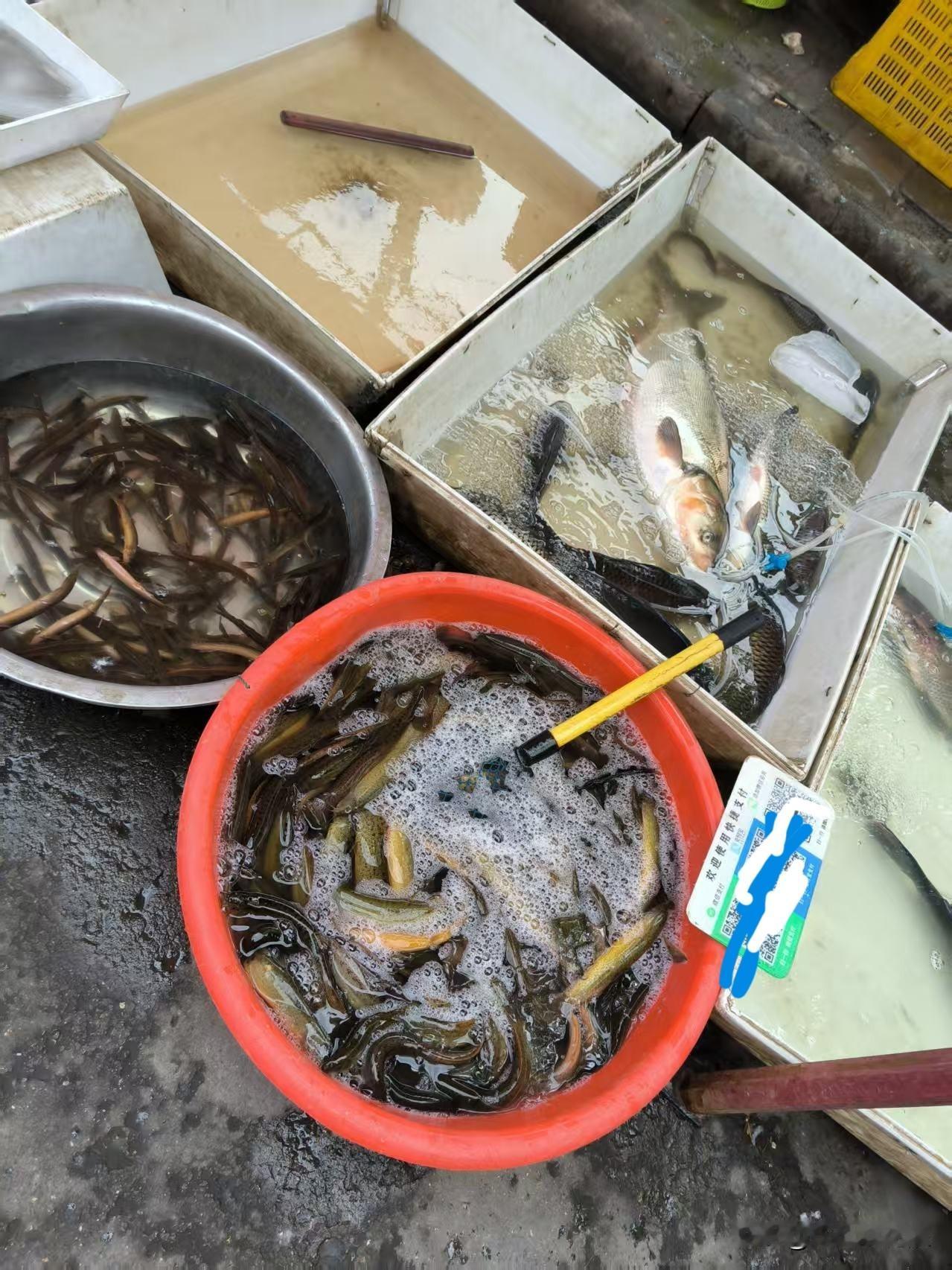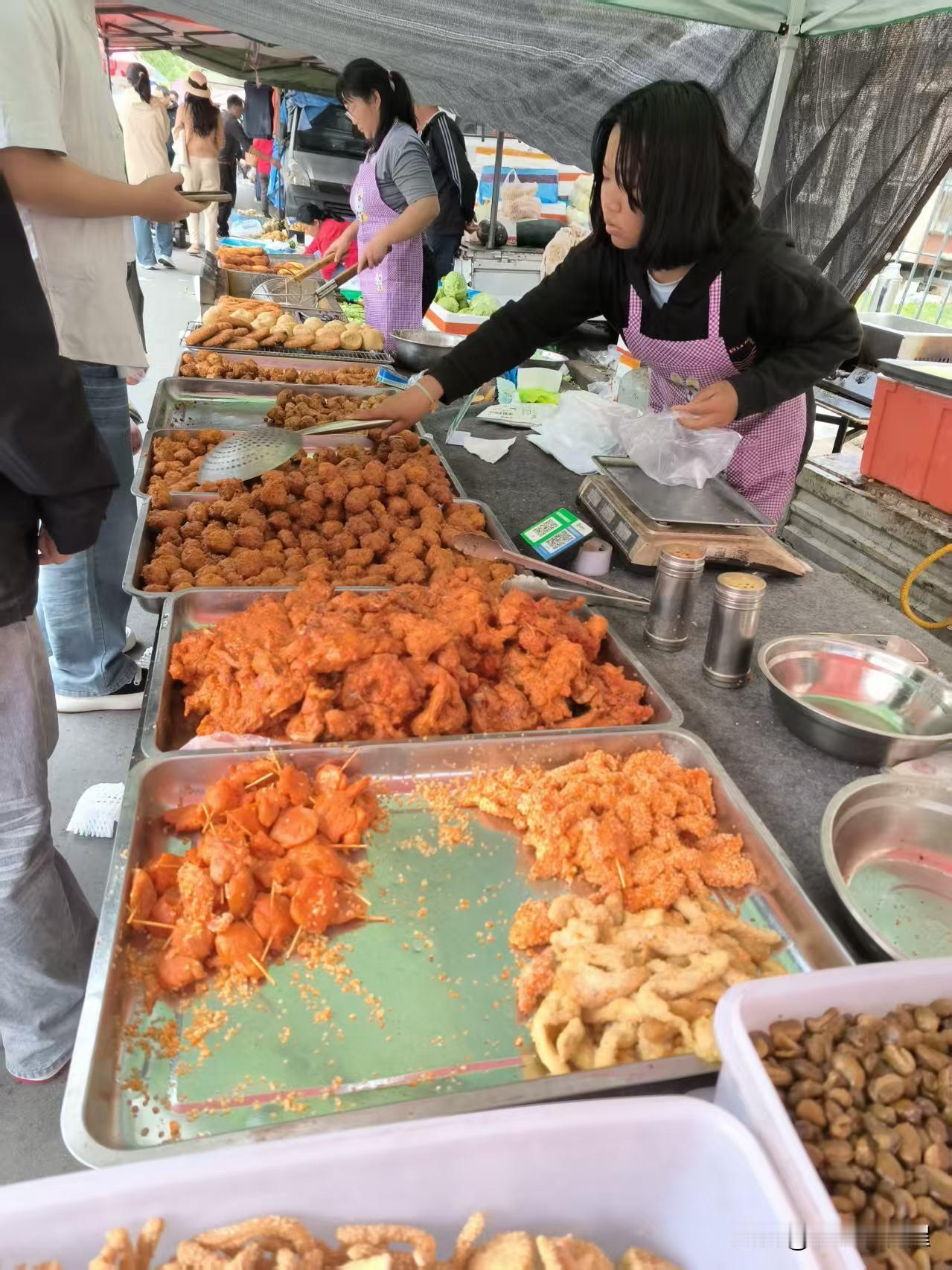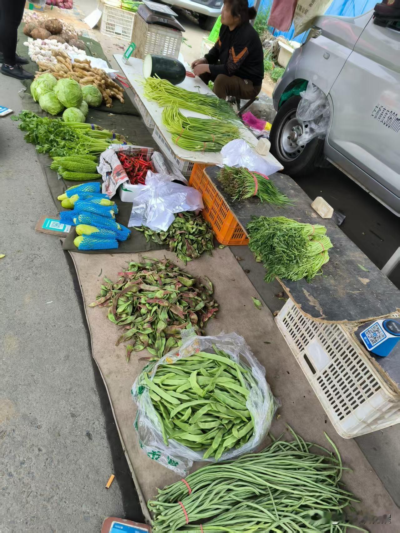 集上摆摊卖嘛的都有,蔬菜水果价格都不贵。在家门口买几根香菜就得一块钱,集上卖两块钱一捆;豆角和新土豆也比市场卖的便宜,菜笋3块钱一根,大葱一捆有六七棵卖两块,真够便宜的。卖炸糕熟食的生意也红火,还有卖红烧大鲤鱼的。