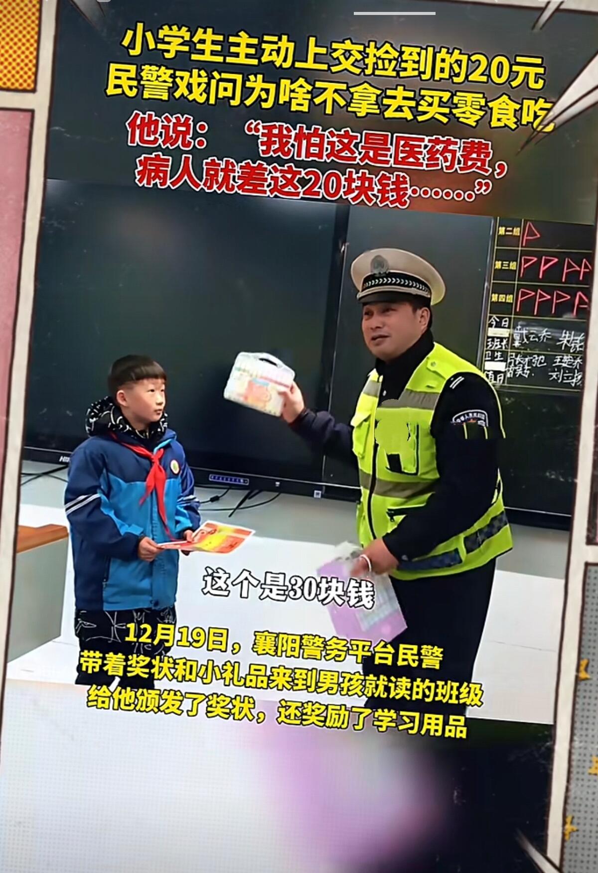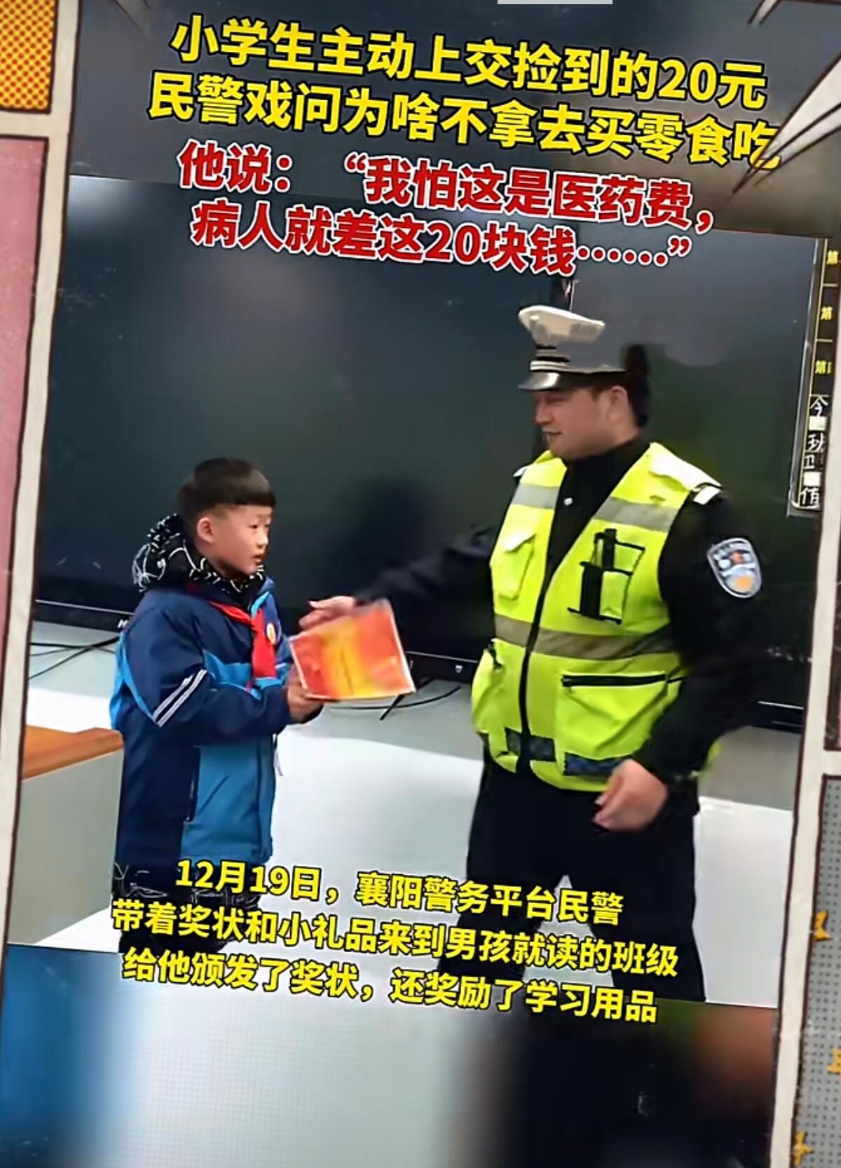 襄阳一个三年级的小男孩,干了件特简单的事儿,但把全网都给整破防了。这小孩在公园玩,捡了20块钱和一个篮球。他没想着买辣条,扭头就送到火车站警务站了。