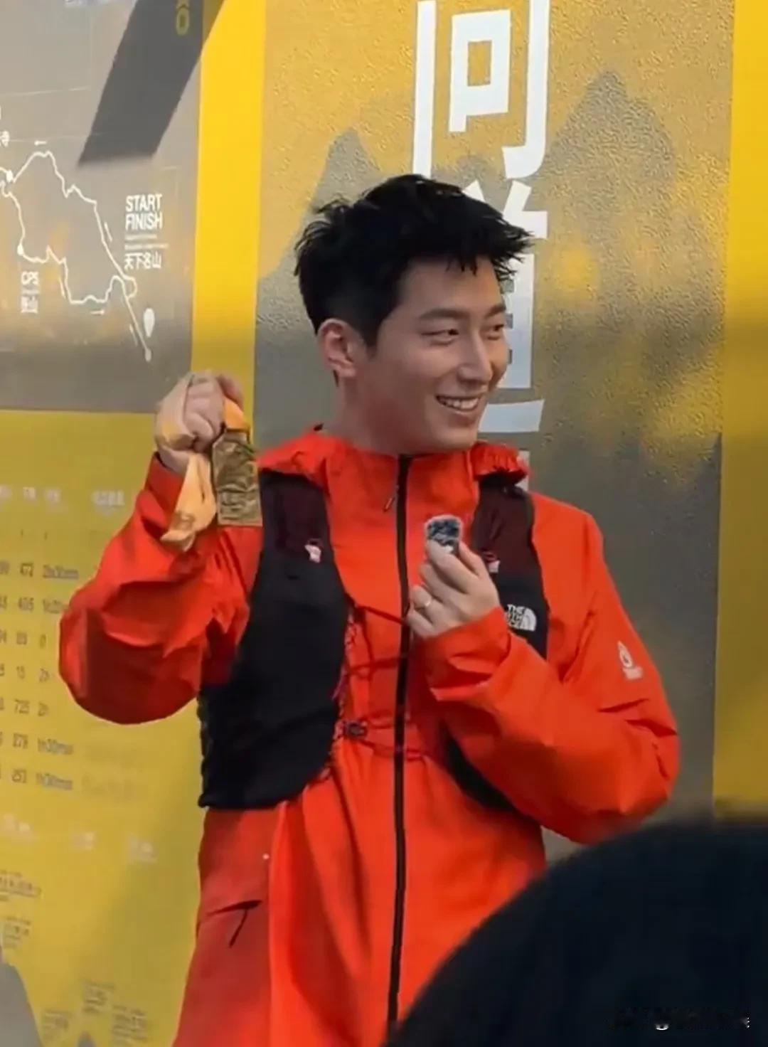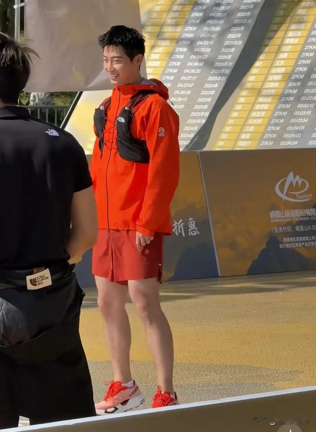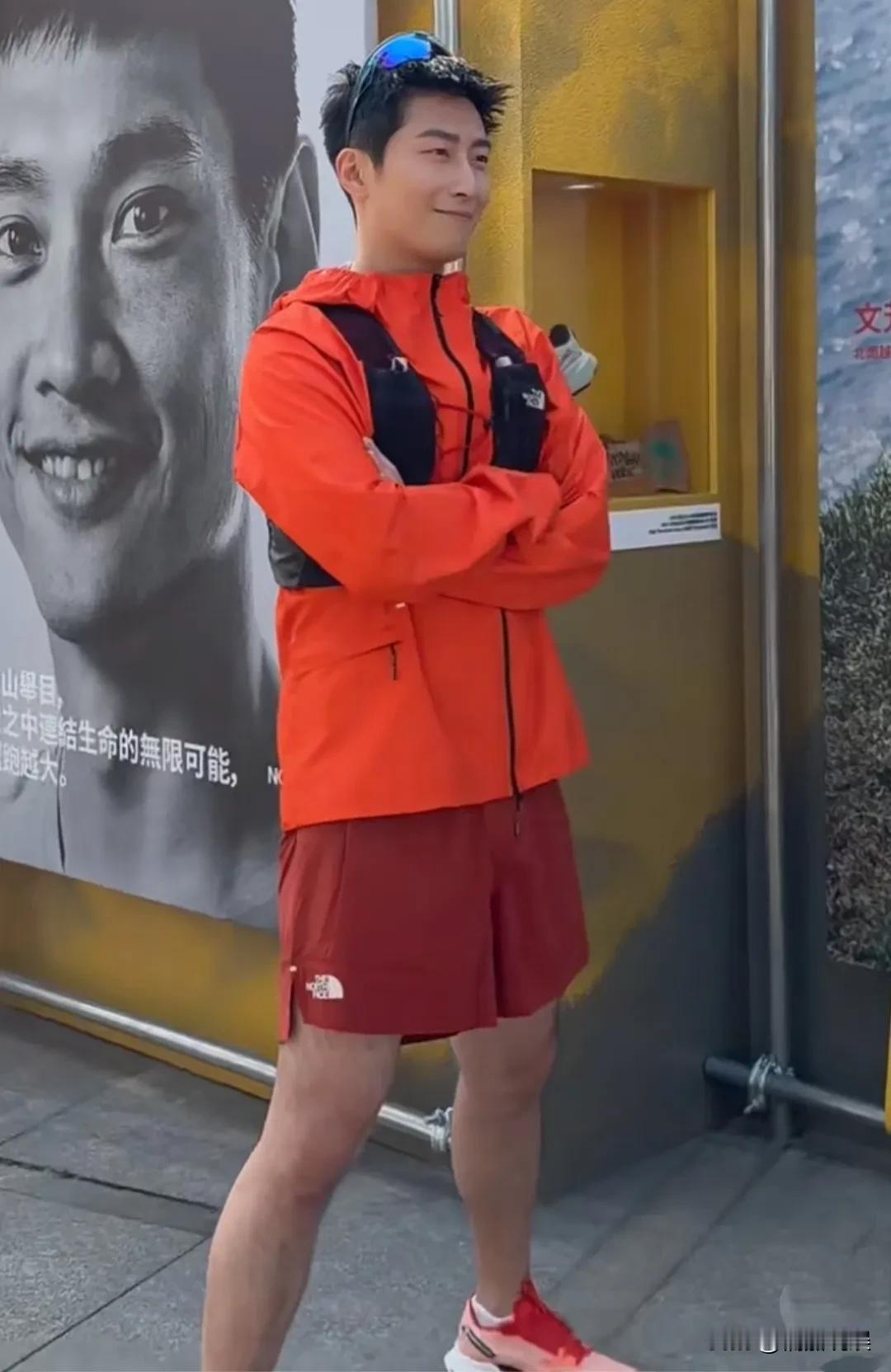 换了发型的他,穿着一件橙红色运动衣配酒红色短裤,肤色健康,个子高挑,身形结实,腿上肌肉线条紧致,这身材练的可真好。