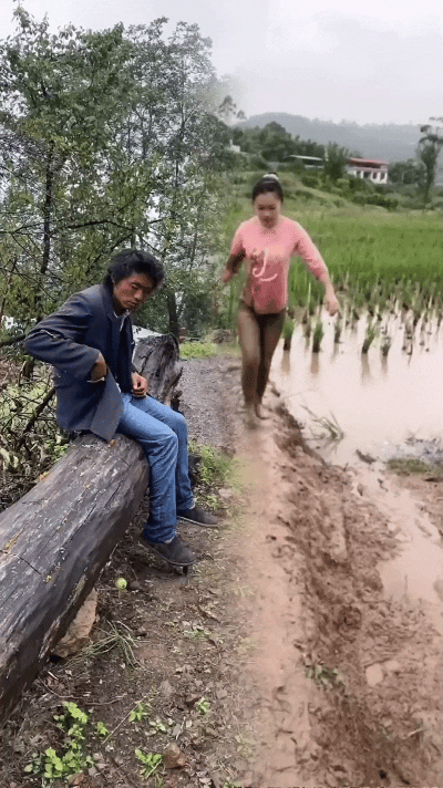 那声音又突然又大,直接把美女吓了一激灵!她脚下一滑,“哎哟”一声,顺着泥路就摔了个大仰八叉,结结实实摔进泥里去了!本来是安安静静走个路,结果被这男的一嗓子吓了个趔趄,这男子也太能逗了,把人家吓得栽进泥里,自己还不知道在那儿乐不乐呢!