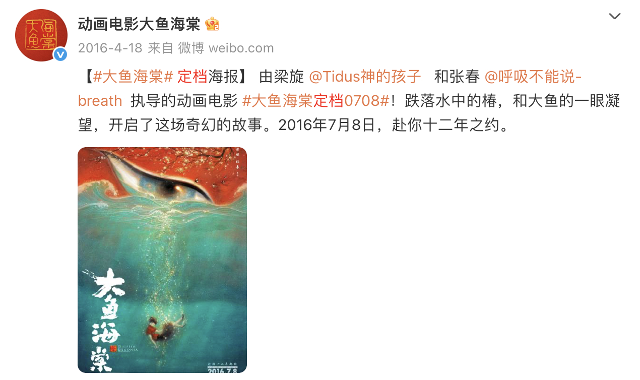 原来大鱼海棠十年了 电影《大鱼海棠》发布一封给椿的生日信,弟弟胤碎碎念着和姐姐椿的过往,念着姐姐生日有没有吃上蛋糕,当年电影里那个捏云的小男孩,思念了姐姐整整十年,十年前的今天也是《大鱼海棠》宣布正式定档和大家见面的日子。十年了,当年陪你看《大鱼海棠》的人还在你身边吗?