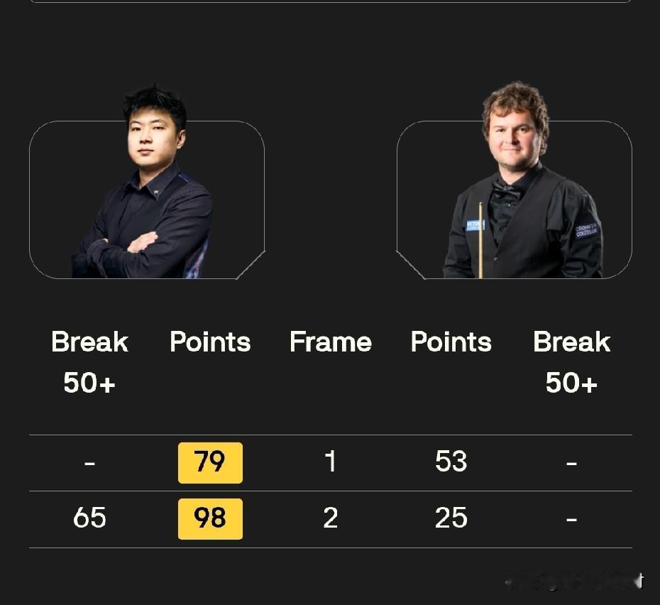 卫冕冠军赵心童目前2:0领先海菲尔德。两局都是抓住机会上手拿下比赛。第一局他单杆打出43分,第二局更是单杆破50。从前两局来看,赵心童的状态正在慢慢找回,毕竟对手已经打了三轮资格赛,而赵心童只是第一场比赛。