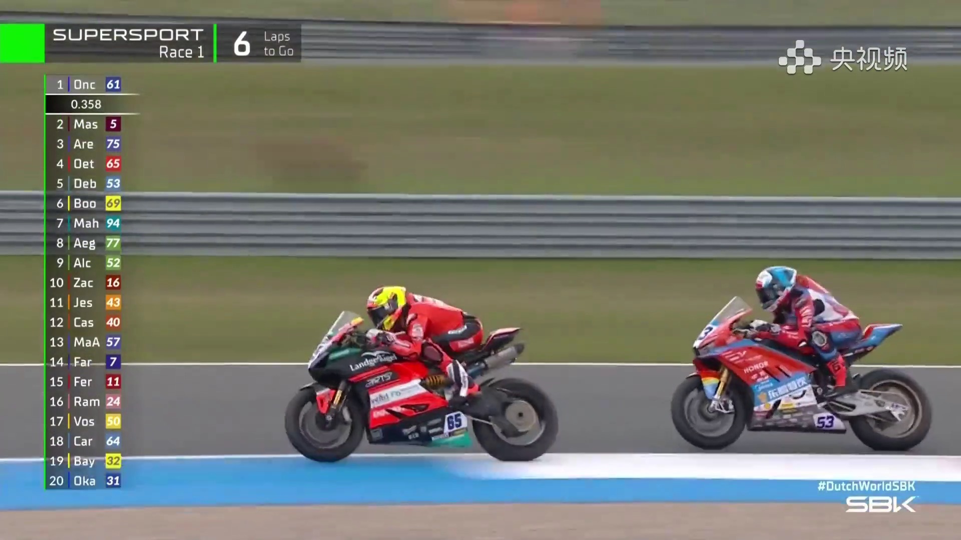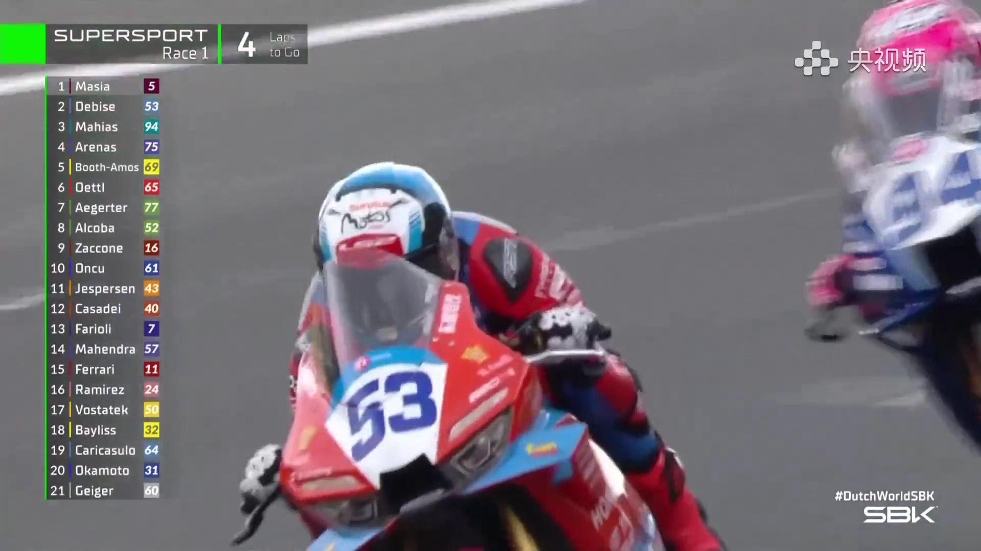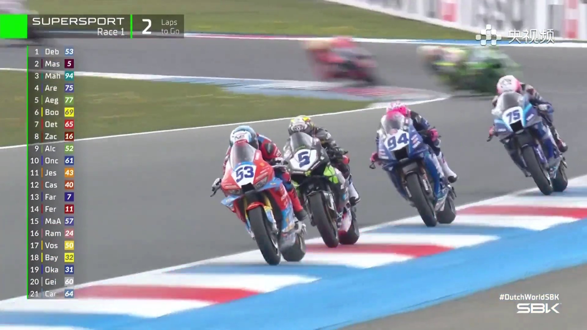 世界超级摩托车锦标赛荷兰站SSP组决赛第一回合,张雪机车53号车手瓦伦丁·德比斯在比赛中一度升至第一,最终获得第四名,5号车手Masia获得冠军。
