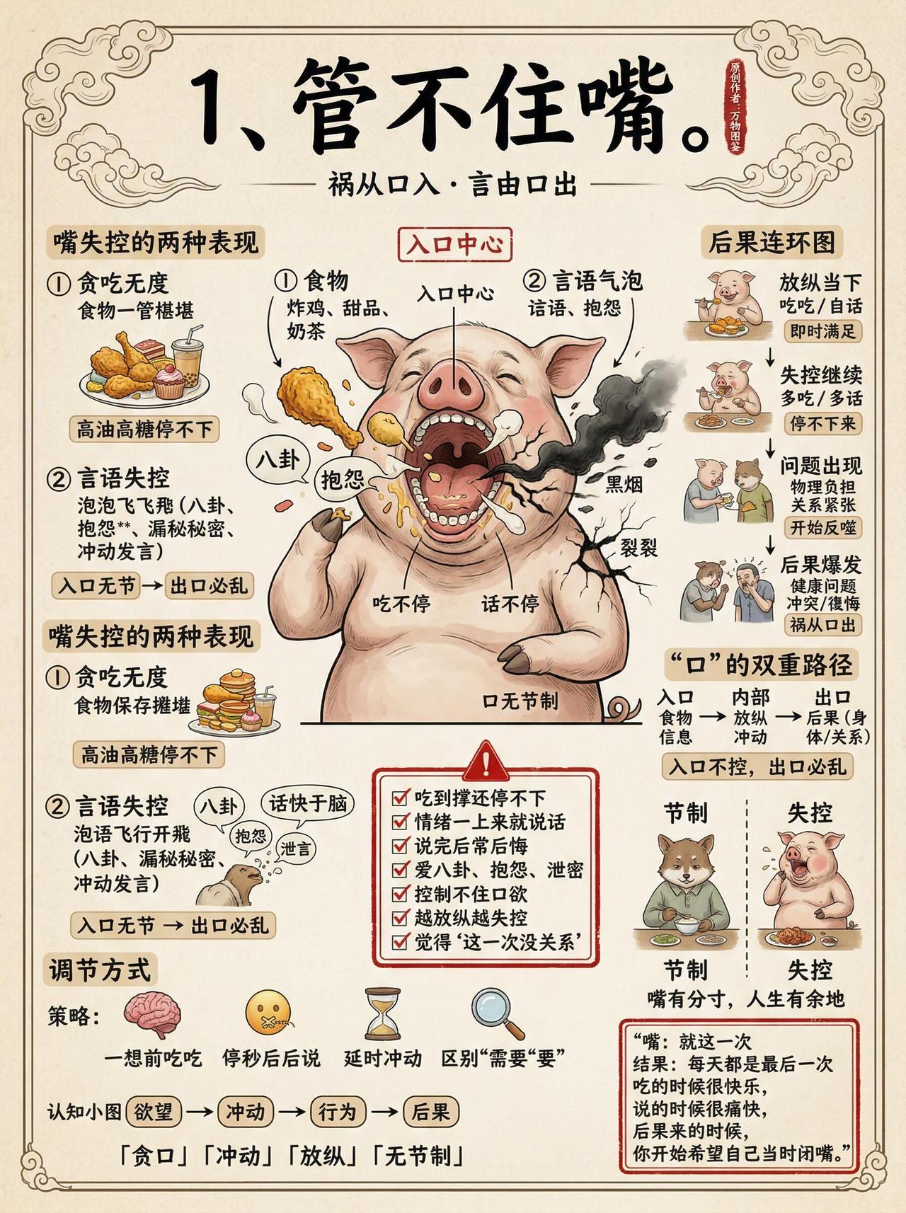 贪吃放纵、口无遮拦,乱吃伤身体,乱说毁人脉,祸永远从口先出