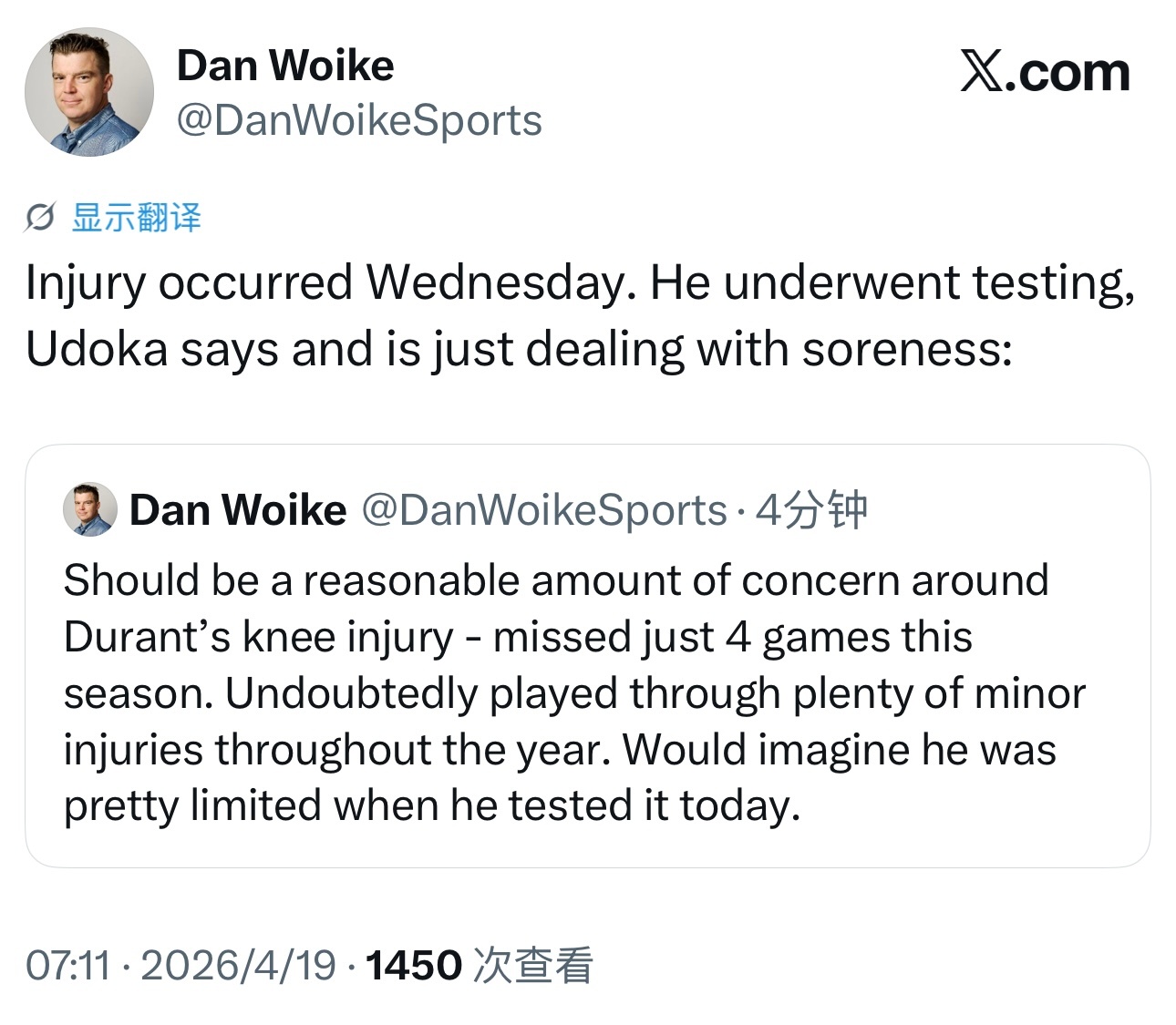 Dan Woike:乌度卡表示,杜兰特的伤病发生在周三。他已经接受了检查,目前只是在应对酸痛感。