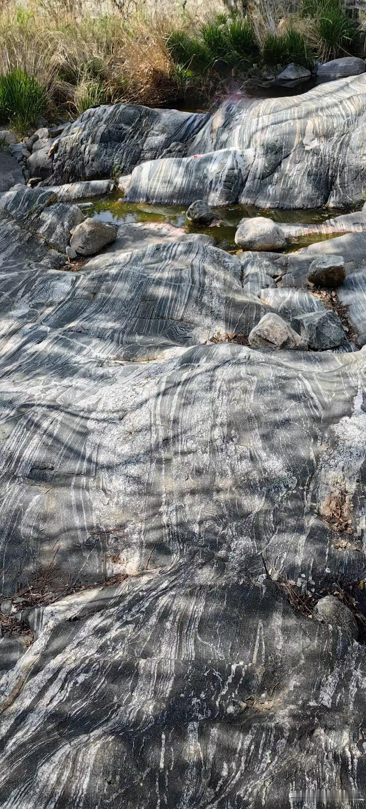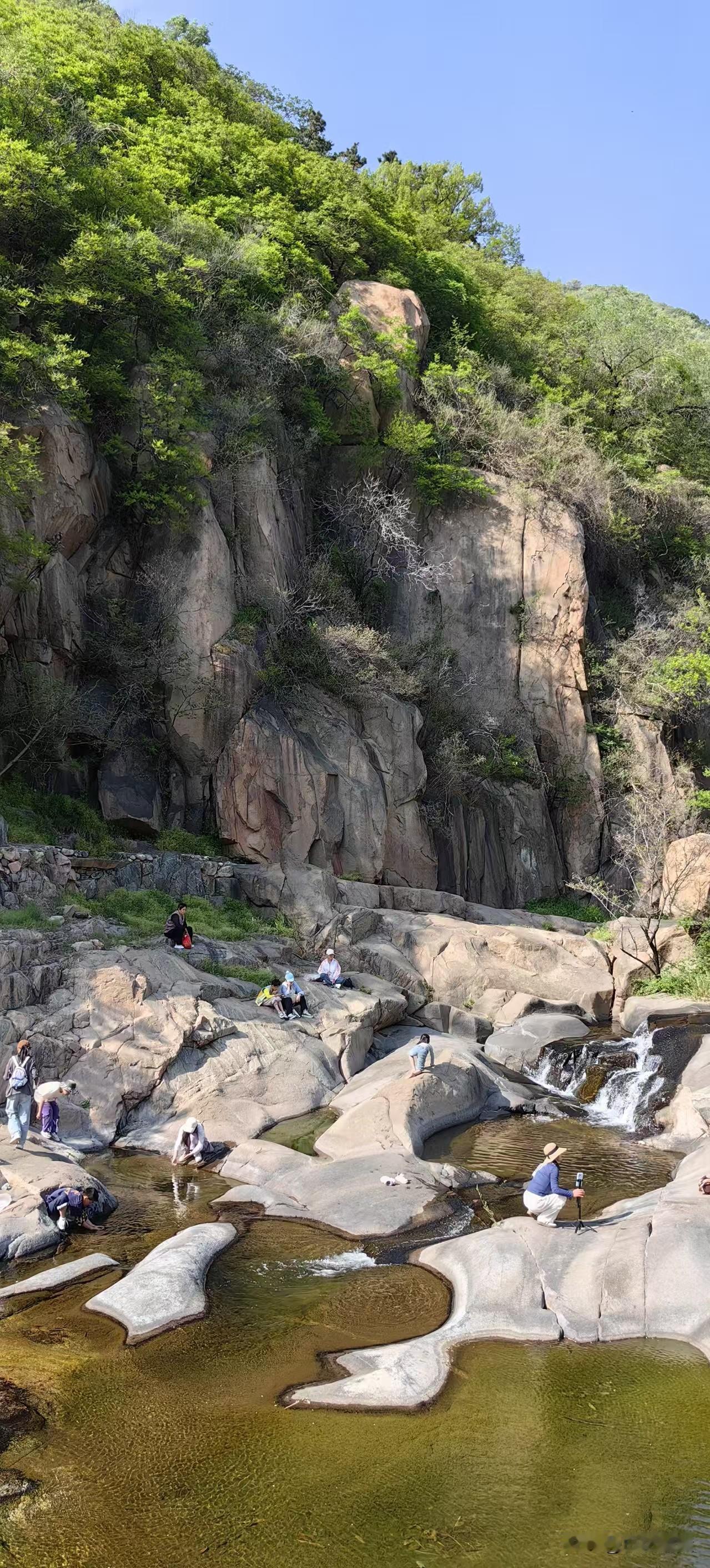 正是不冷不热的时节,沿途时见儿童戏水,平展光滑的巨石之上,大人们躺在上面,舒舒服服晒太阳。