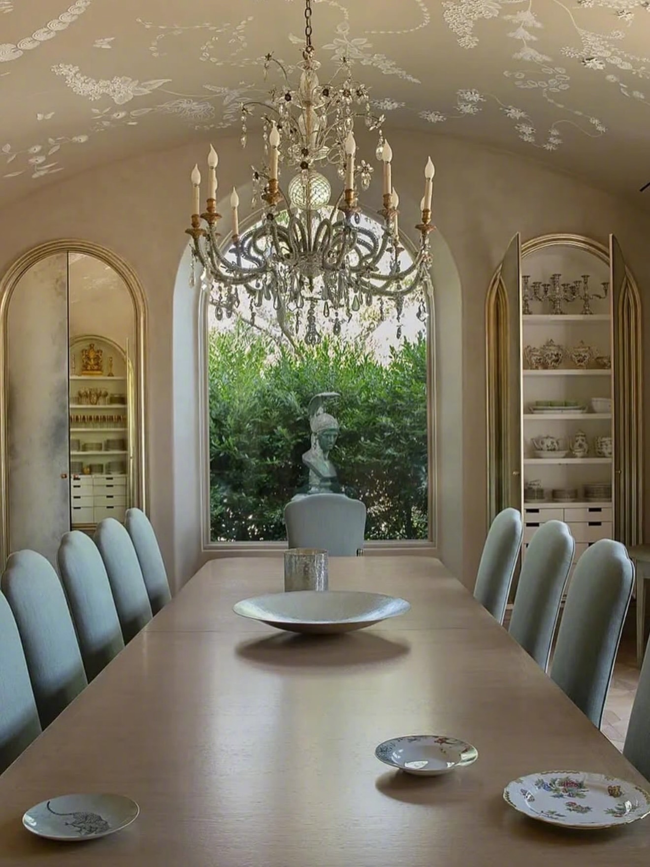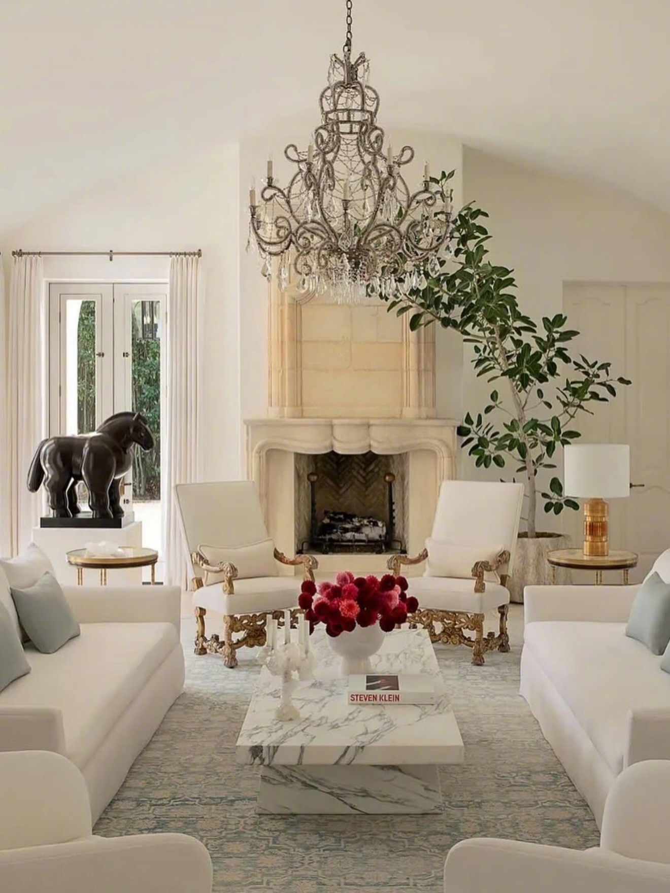 客厅以一座18世纪的法国石灰石壁炉和一张波斯大不里士地毯为视觉核心,搭配既奢华又宜居的家具。装饰细节:如植物纹样墙面装饰和极具存在感的灯具,为整体空间增添了层次感与个性。