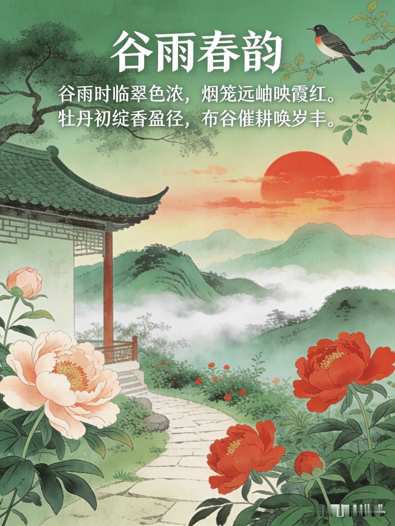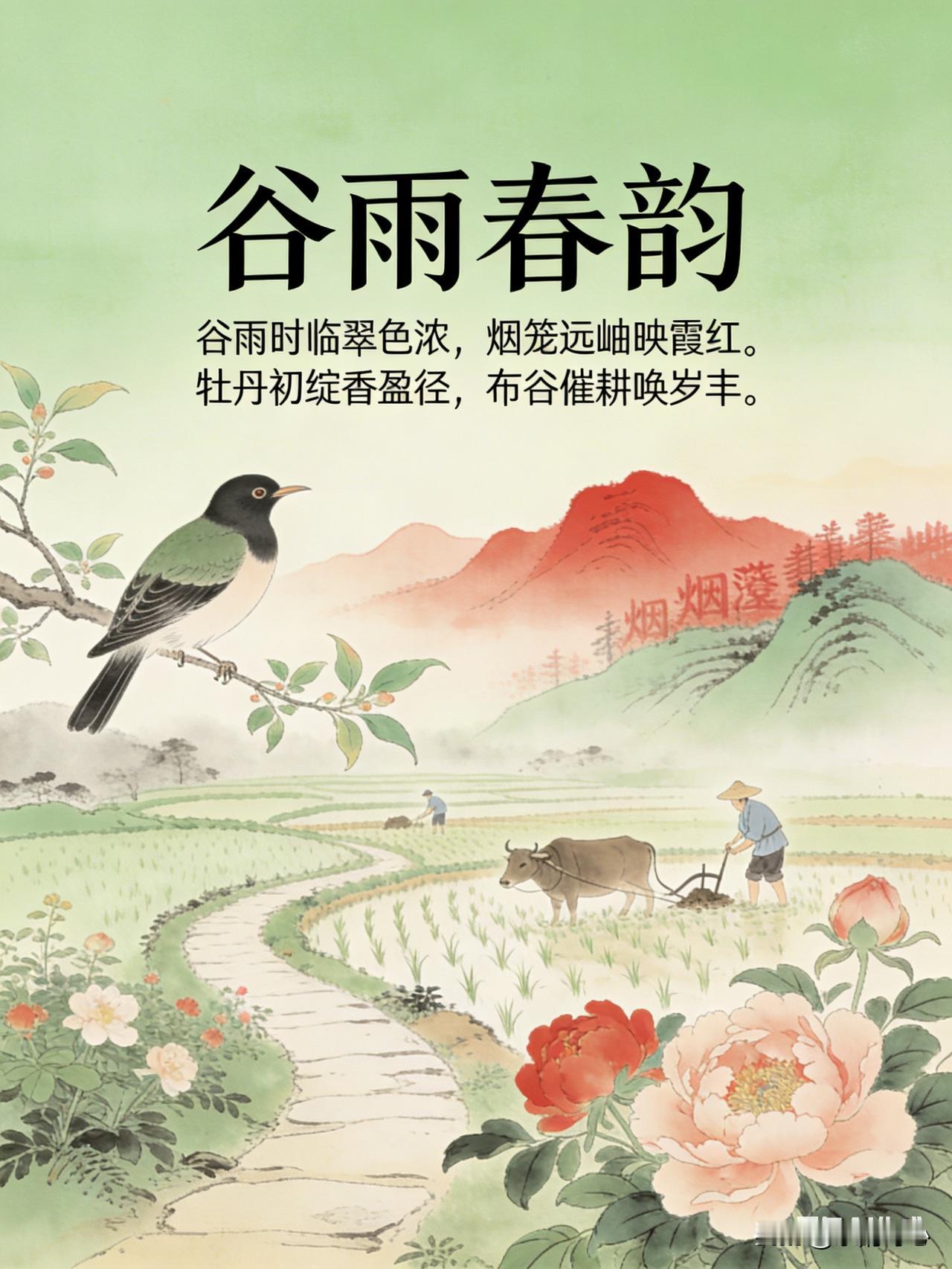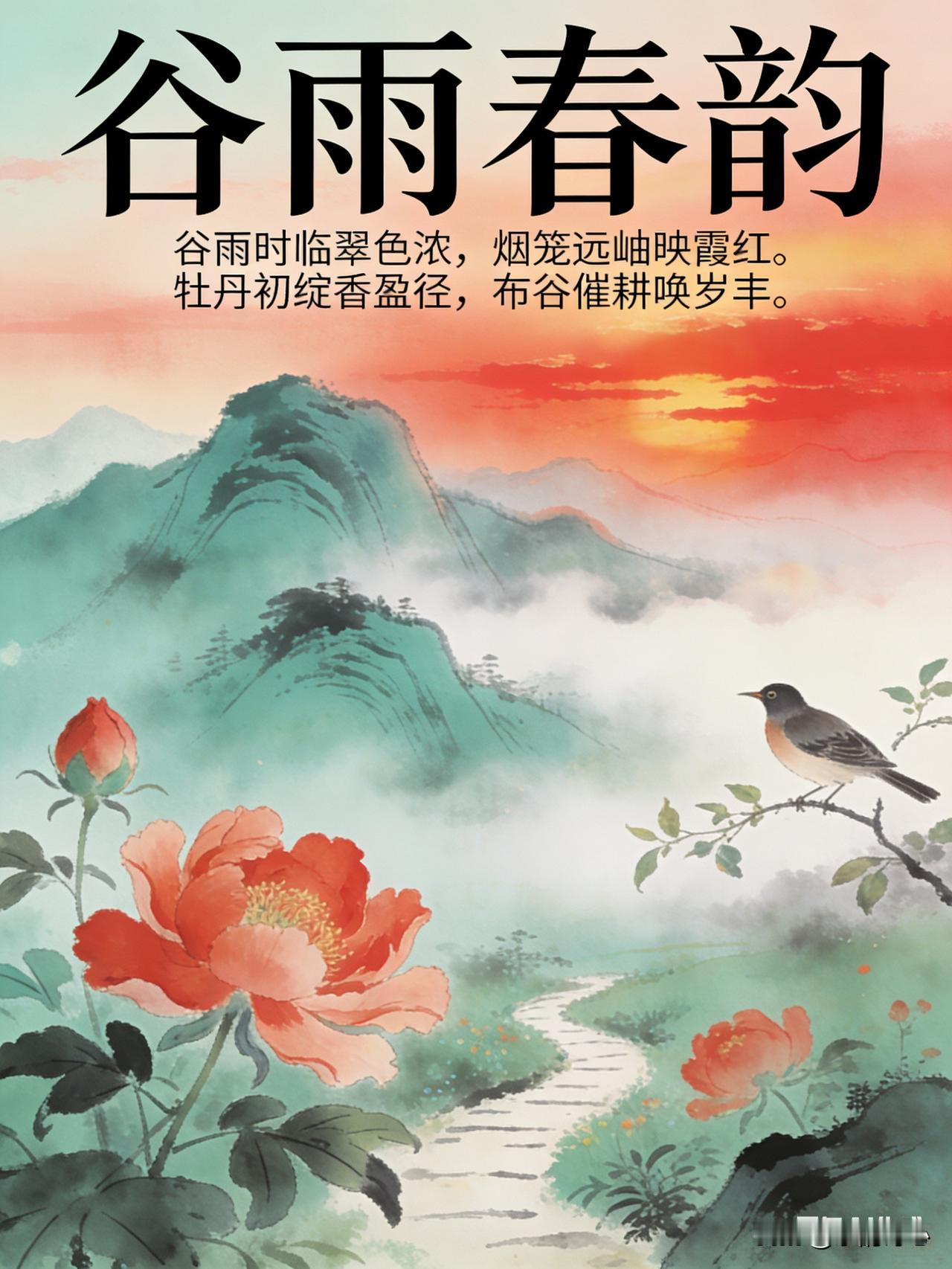 这首诗词的首句“谷雨时临翠色浓”,点明谷雨时节到来,此时大地万物生长旺盛,绿色愈发浓郁,展现出谷雨时节生机勃勃的景象。次句“烟笼远岫映霞红”,描绘出远处山峦被烟雾笼罩,与天边红霞相互映衬的美丽画面,增添了一份朦胧而绚烂的美感。第三句“牡丹初绽香盈径”,谷雨前后是牡丹盛开的时节,娇艳的牡丹刚刚绽放,香气弥漫在小路上,凸显出谷雨时节特有的花卉景观和芬芳气息。尾句“布谷催耕唤岁丰”,布谷鸟在谷雨时节开始鸣叫,仿佛在催促人们耕种,寄托了人们对丰收的期盼,使诗歌不仅有自然之景,更蕴含了人文情怀。