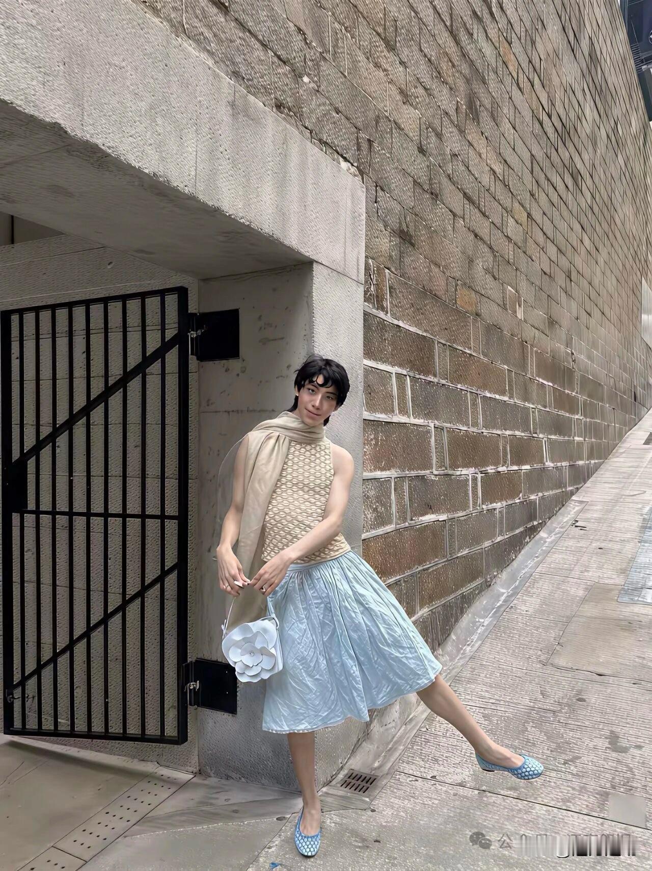 伊能静与前夫庾澄庆之子恩利,再度身着裙子亮相。此次他穿的是淑女风格的蓝色裙子,搭