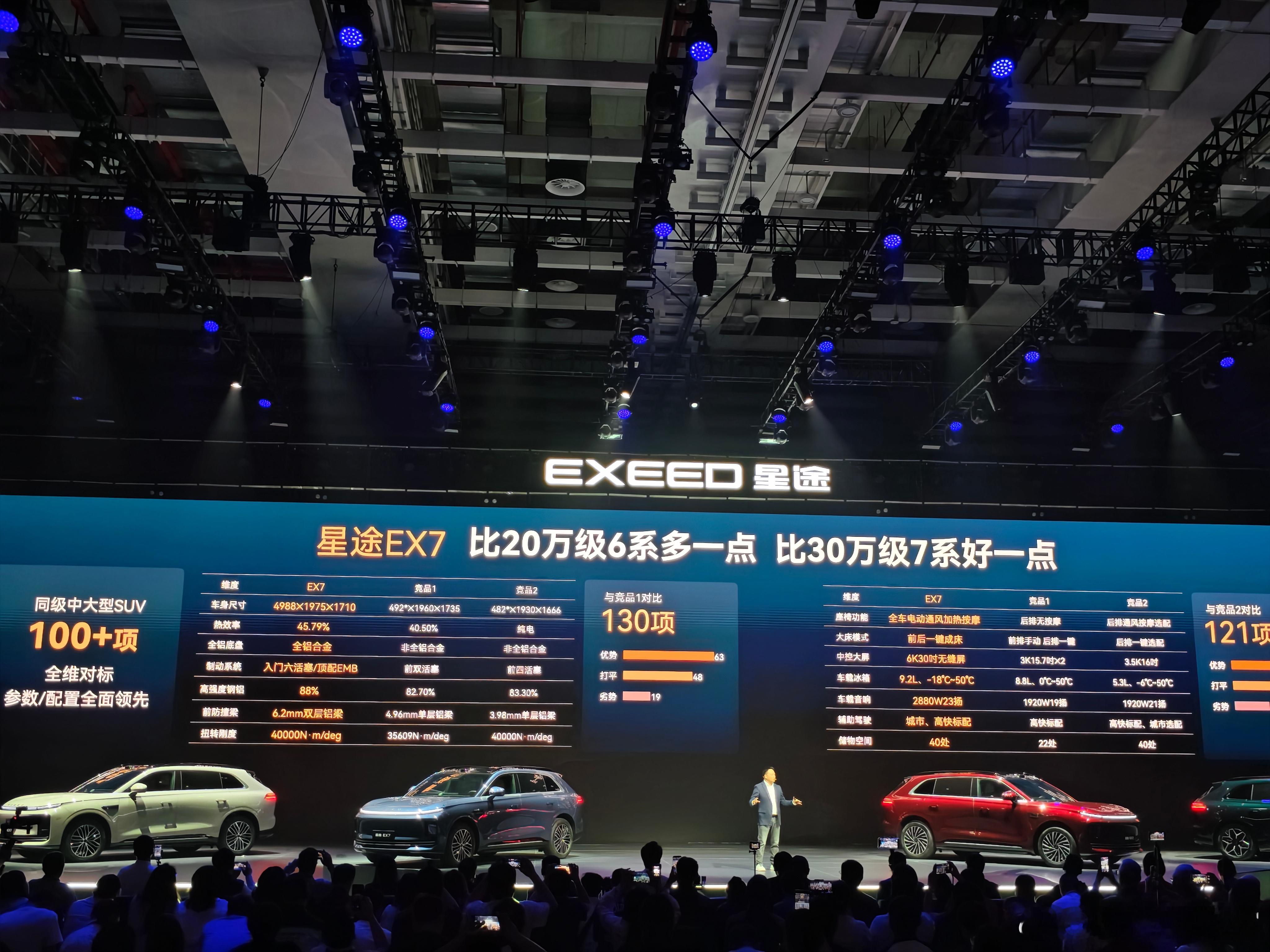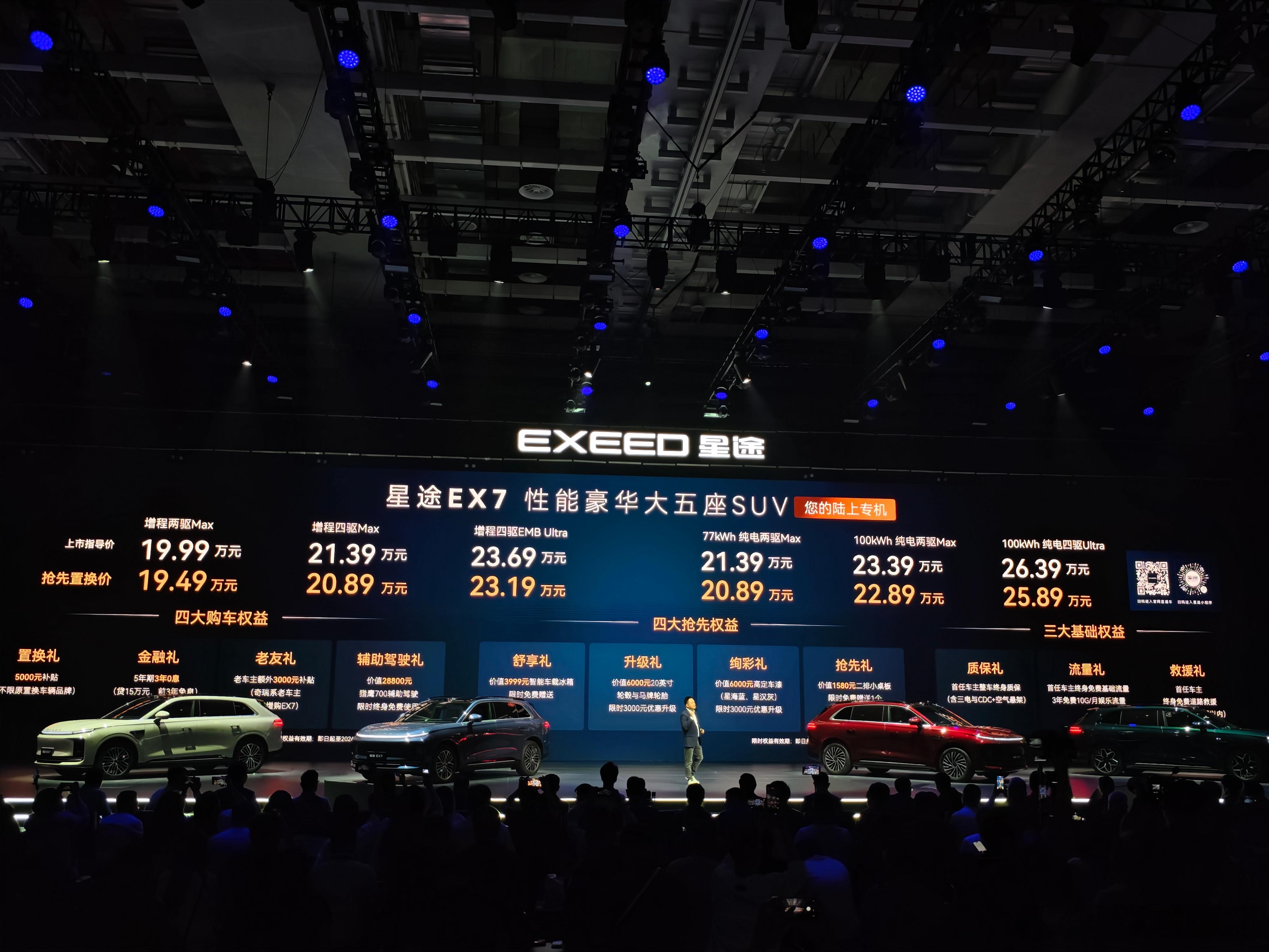 内饰方面,星途EX7配了块30英寸6K无缝一体寰宇屏,16:5的宽度比,用了高通8295P芯片,24GB运存,全系标配猎鹰700辅助驾驶,有智驾小蓝灯,9.2L的冷暖冰箱,车长4988mm、轴距3000mm,总的提供6个版本,增程两驱Max版售19.49万起、77度电纯电两驱Max版售20.89万起,这价格怎么样