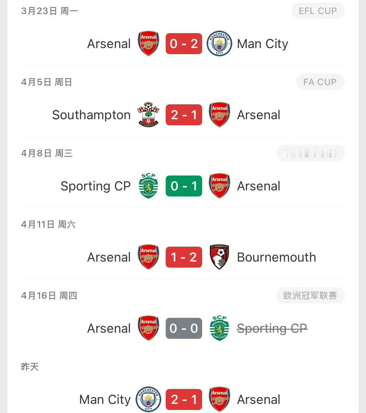 阿森纳最近6场只赢了一场,还是在欧冠赢了葡萄牙体育一场。两次被曼城击败、一次伯恩茅斯、一次南安普顿。