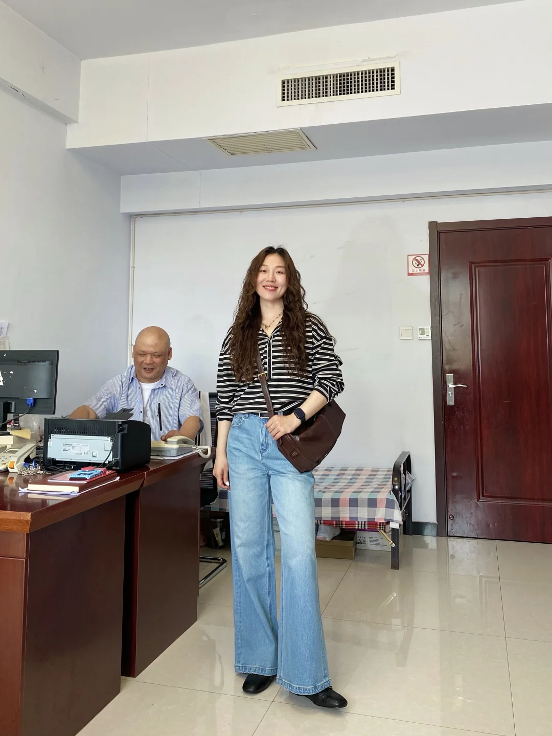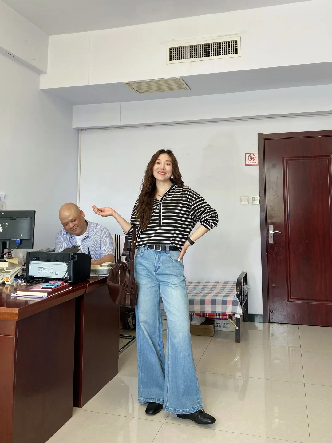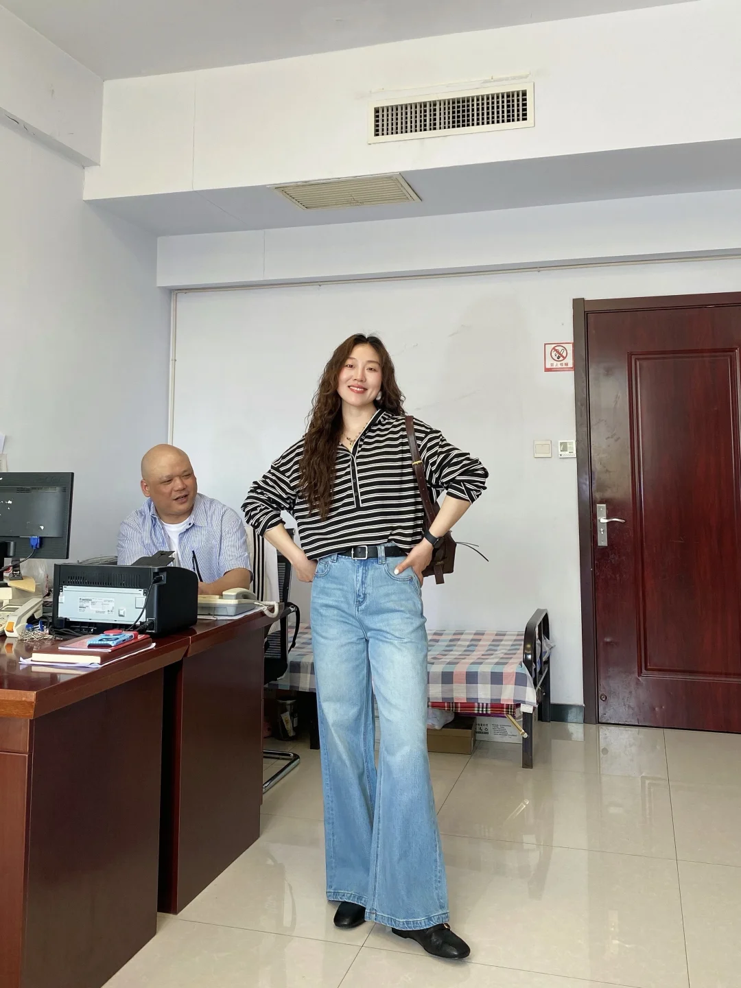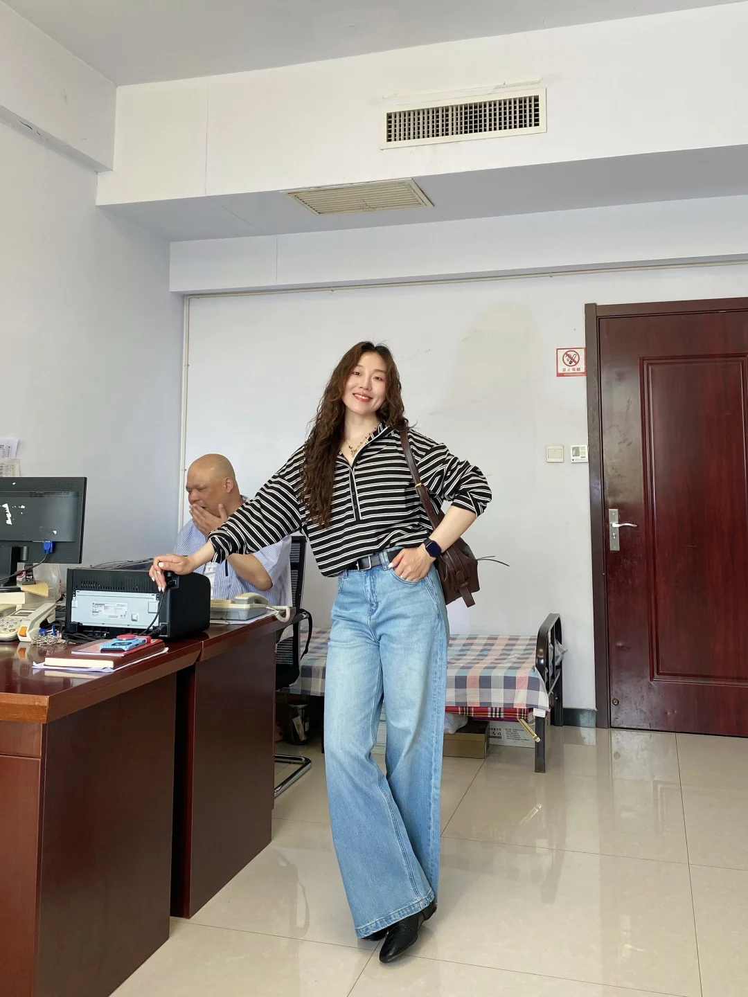 条纹上衣松松垮垮却也慵懒自在