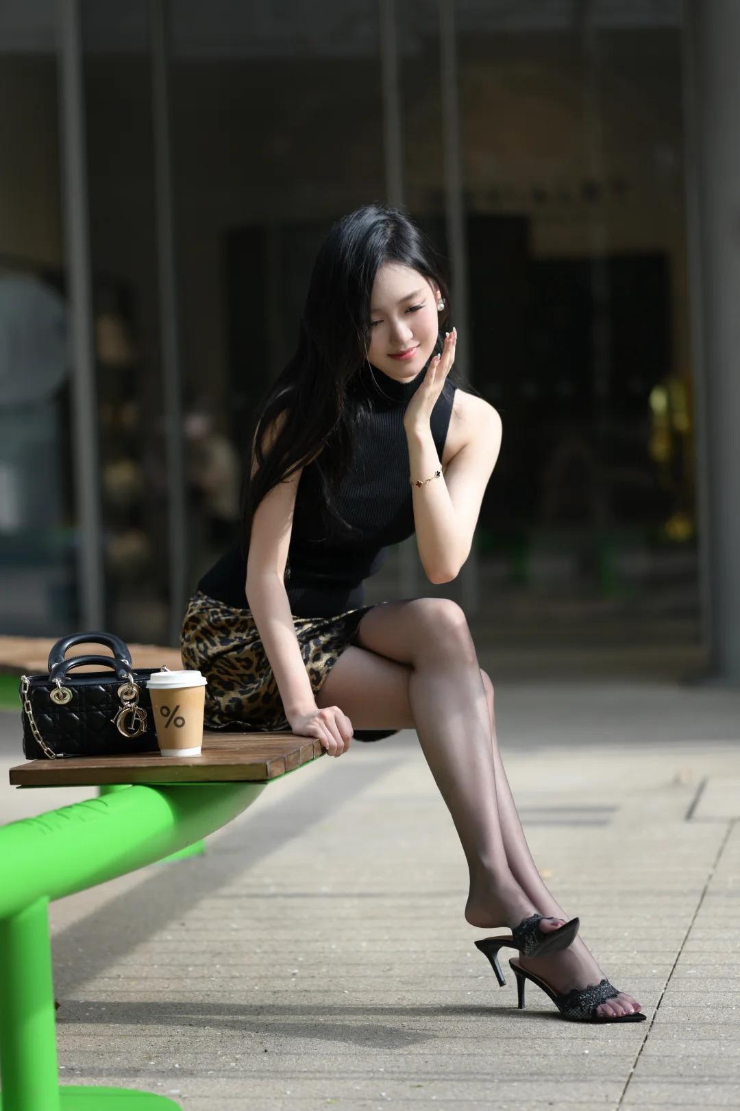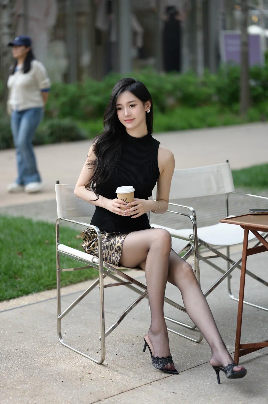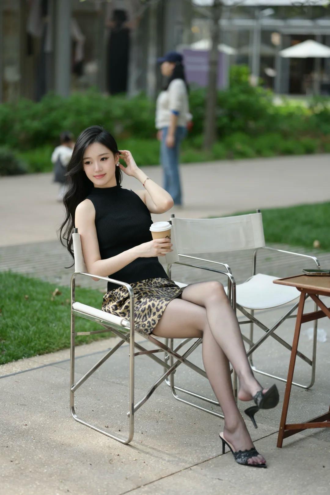 咖啡配阳光,是今日份的松弛感 黑针织 + 豹纹裙,裹着春日的温柔 一杯咖啡放在手