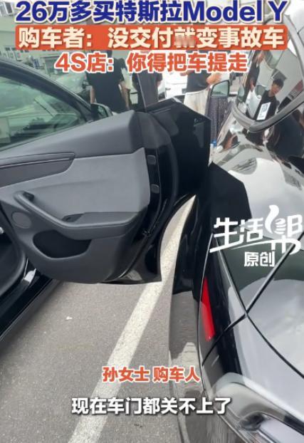 山东青岛,女子买了一辆特斯拉,交付手续办到一半,车门突然被一男子撞毁,女子头大了