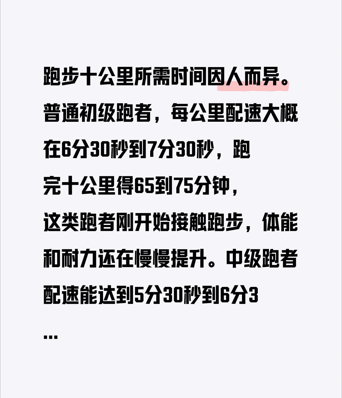 跑步十公里所需时间因人而异。普通初级跑者,每公里配速大概在6分30秒到7分30秒,跑完十公里得65到75分钟,这类跑者刚开始接触跑步,体能和耐力还在慢慢提升。