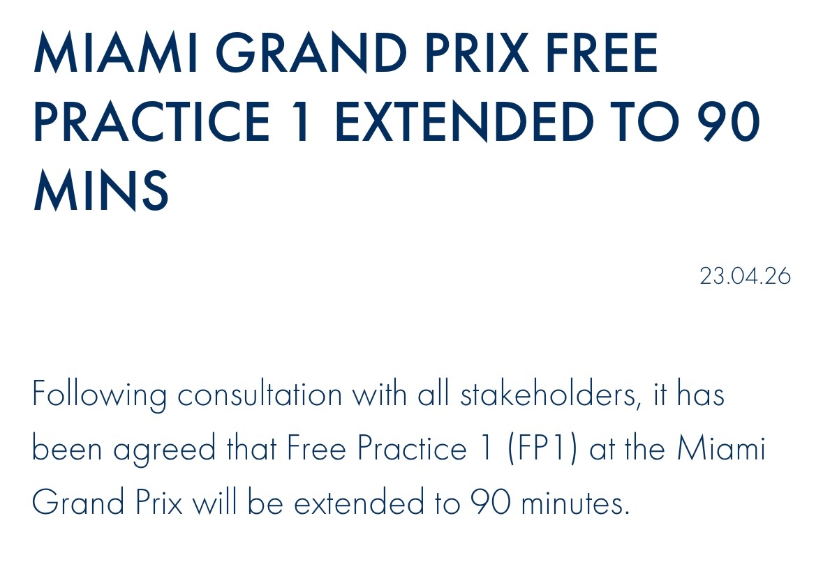 在与各相关方协商后,已决定将迈阿密大奖赛的第一次自由练习赛(FP1)将延长至90分钟。